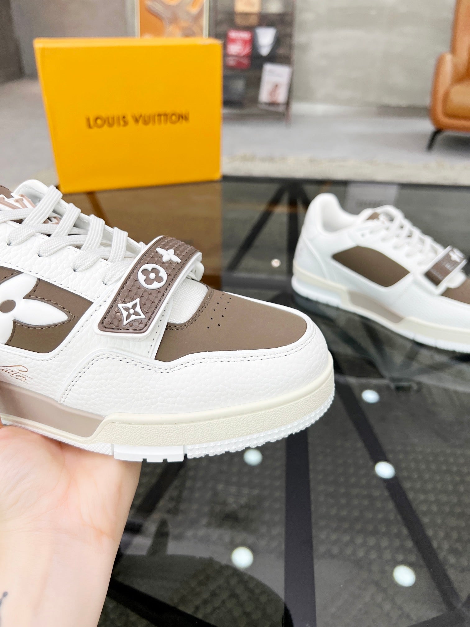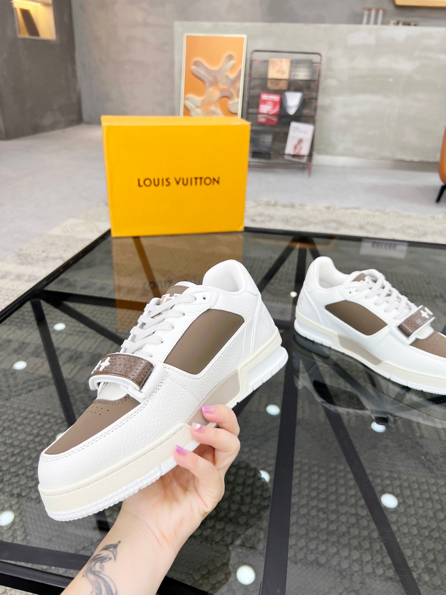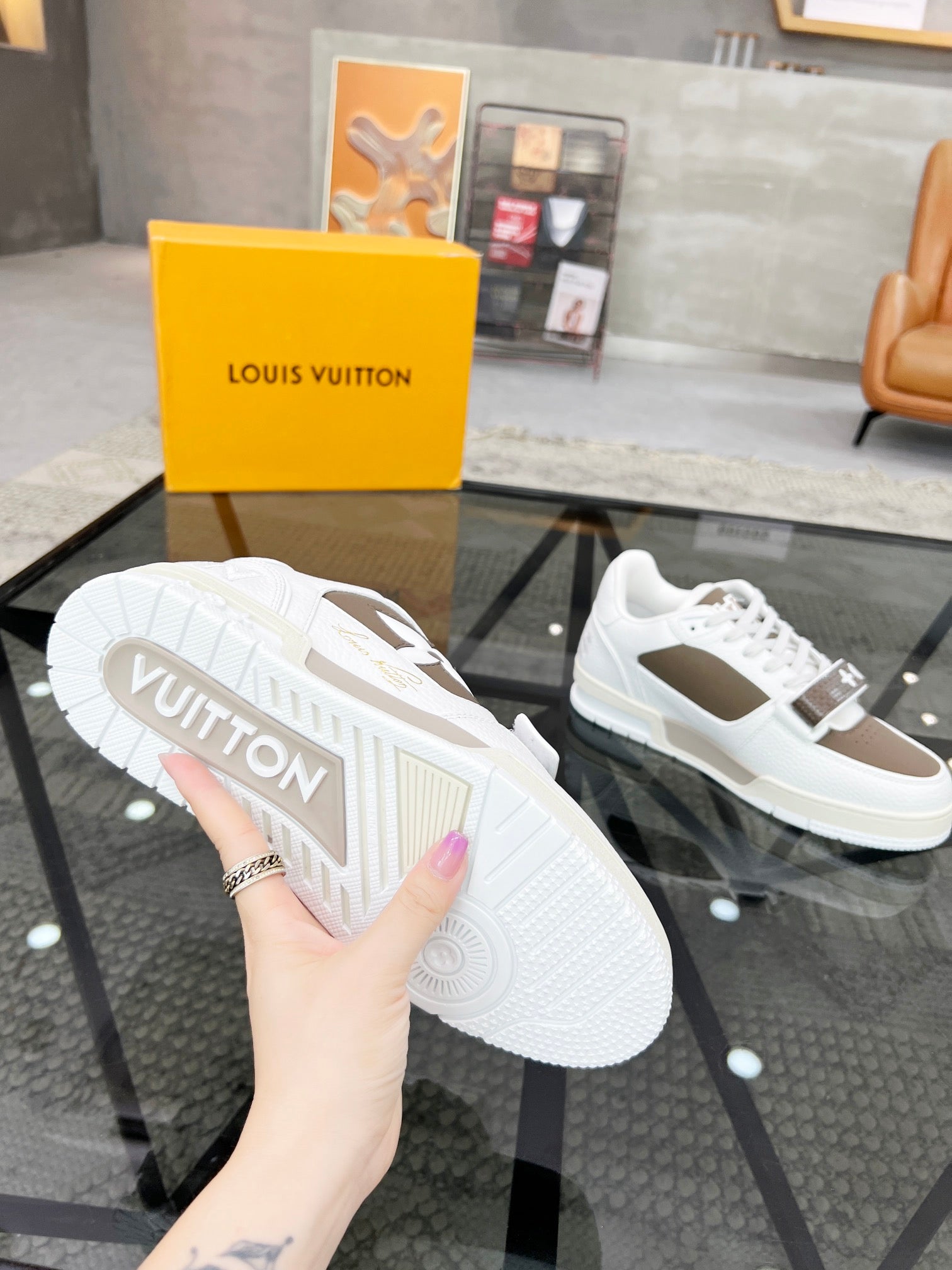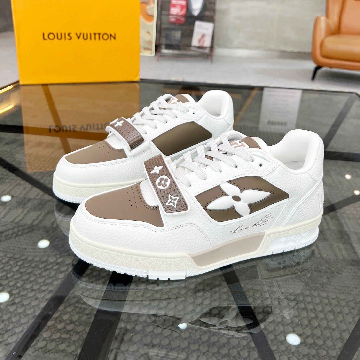LV TRAINER SNEAKER WHITE CALFSKIN MIX CAMEL BEIGE SUEDE