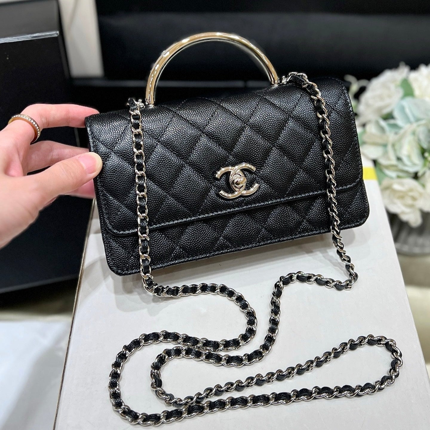 CC 25P Flap Bag Top Handle 18.5cm Black Grained Calfskin