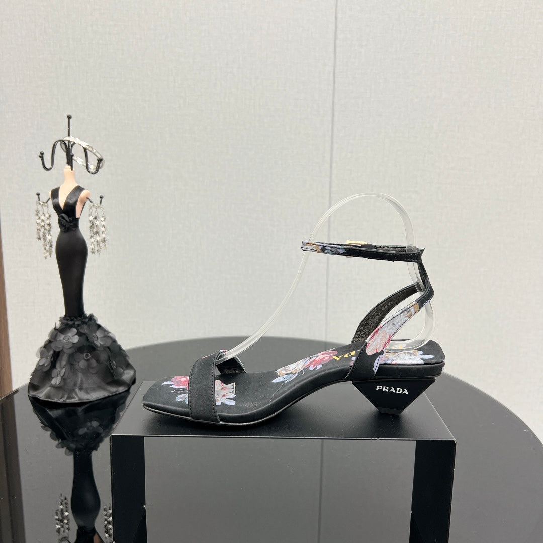 PRA TRIANGLE HEEL FLOWER MOTIF SATIN SANDALS BLACK