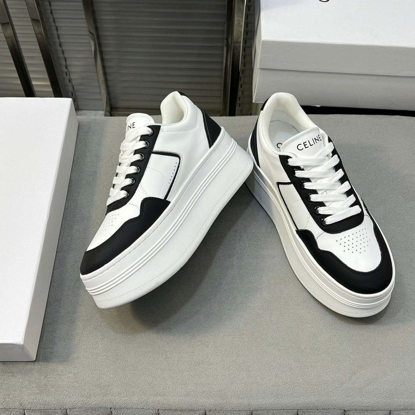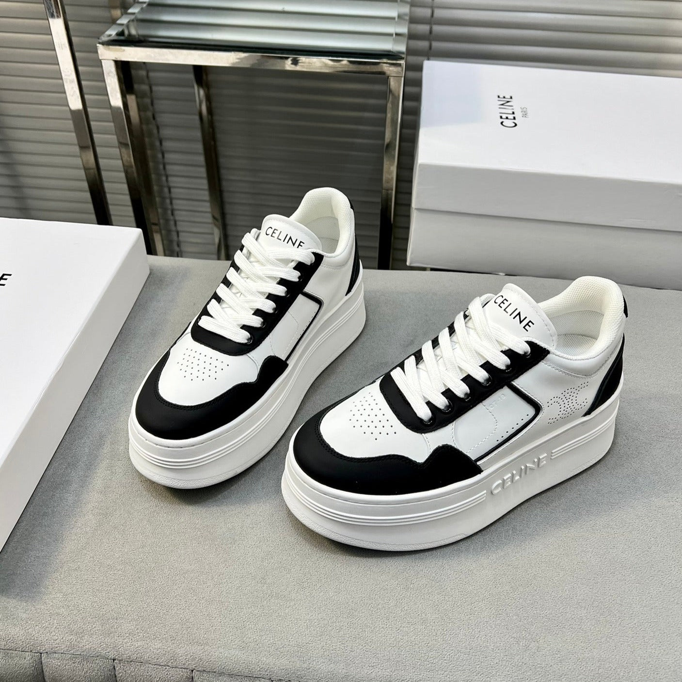 BLOCK SNEAKERS WITH WEDGE OUTSOLE IN CALFSKIN OPTIC BLACK WHITE