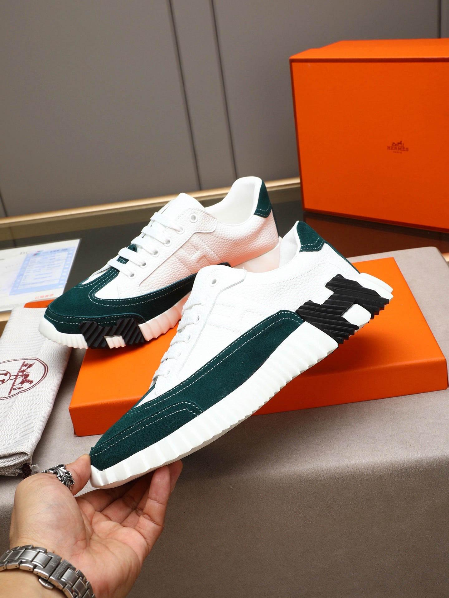 HM Men's Bouncing Sneakers White Green Sheepskin Suede 664382