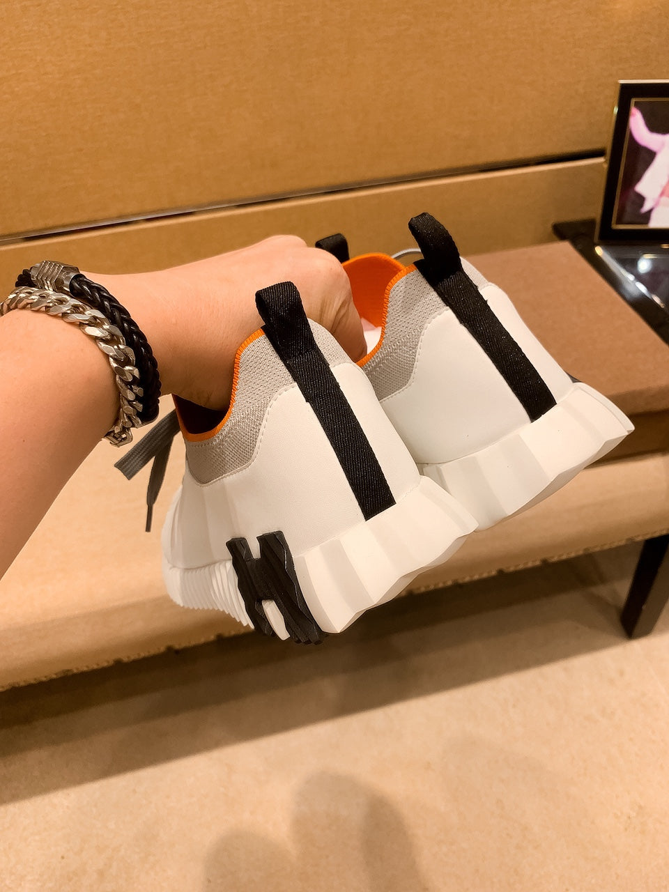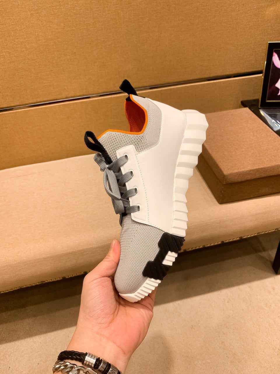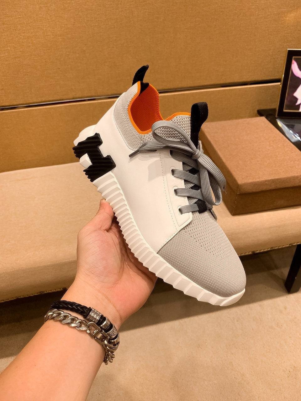 HM Men's Depart Slip-on Sneaker White Grey Knit Cowhide 263685