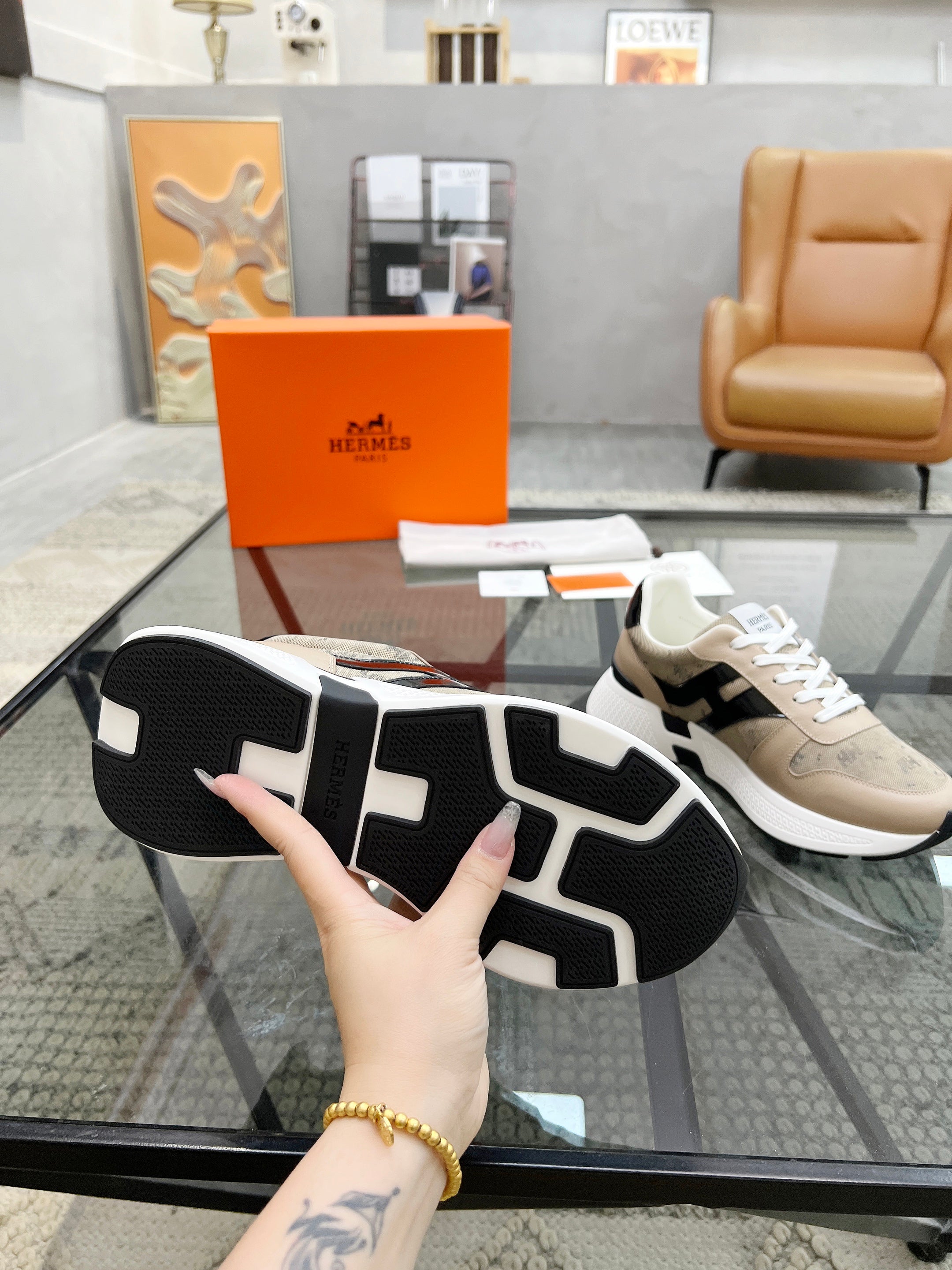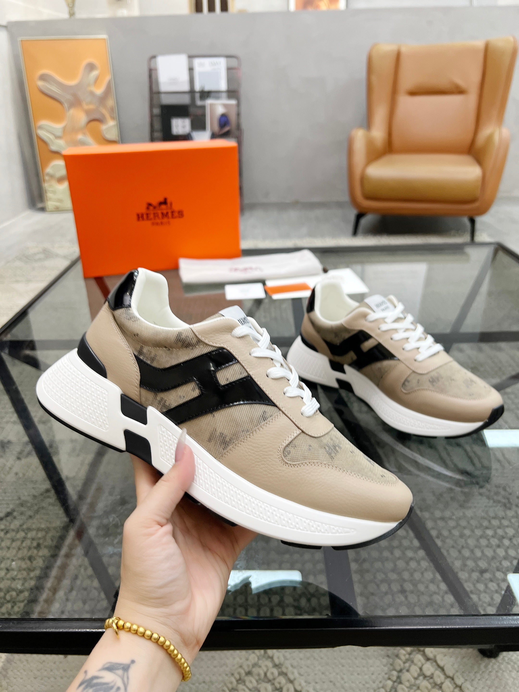 HM Men's Sneaker Beige Cowhide Fabric 603857