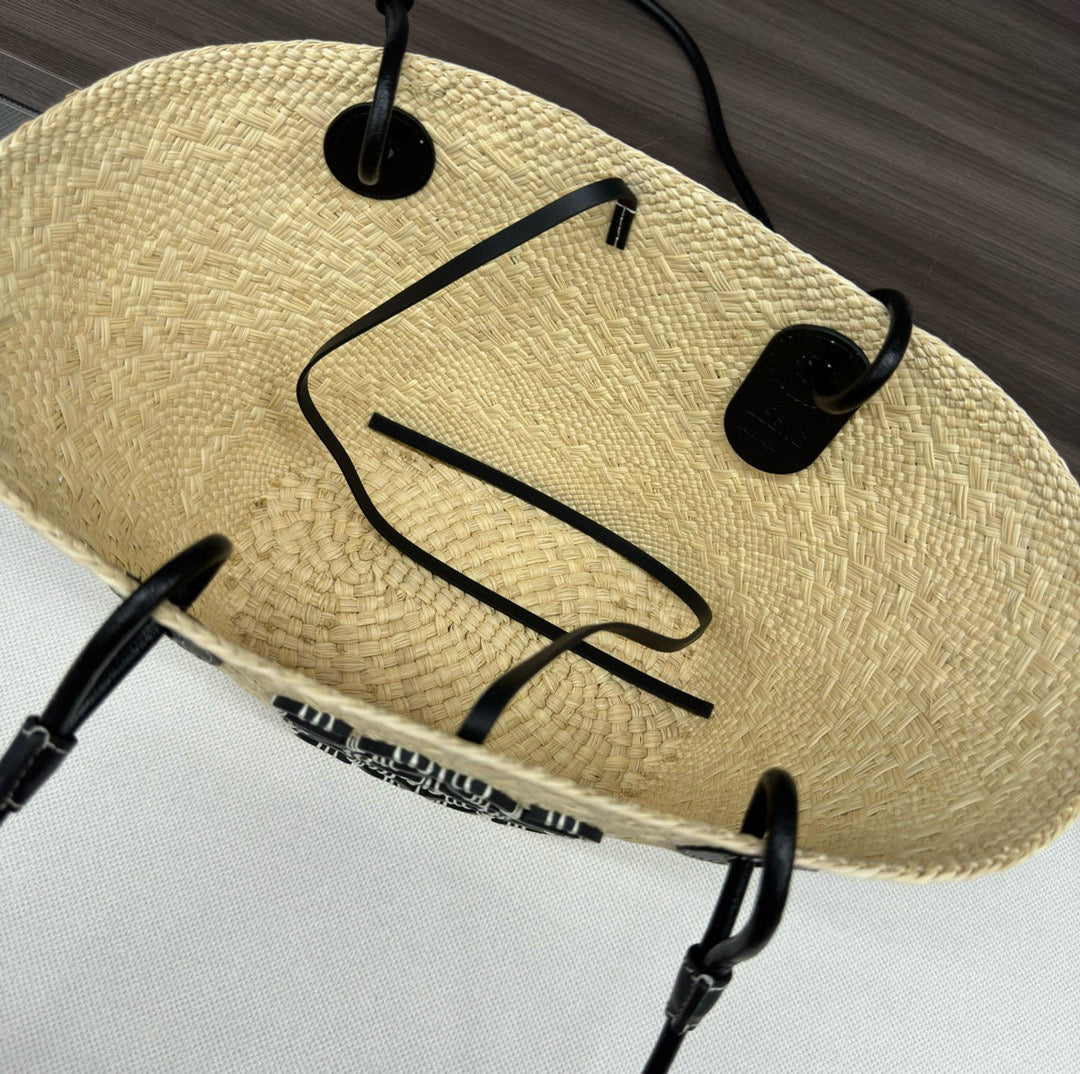 Loew Anagram Basket 34cm Beige Raffia Black Calfskin