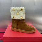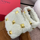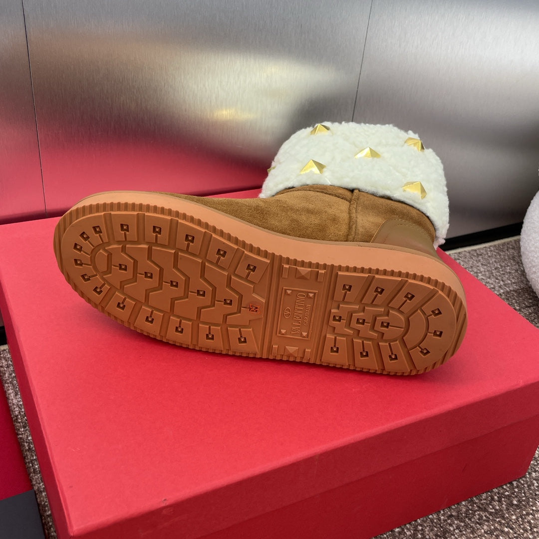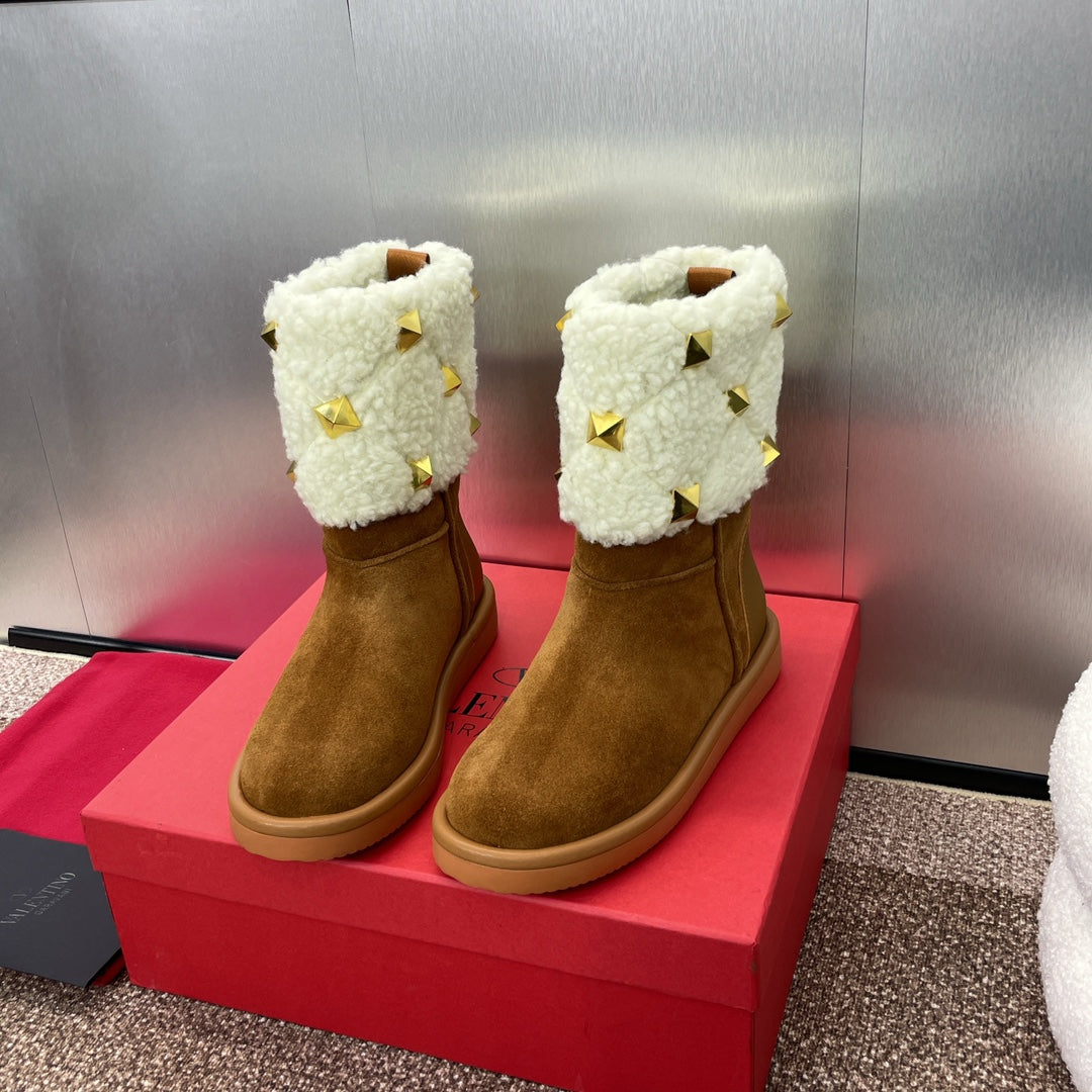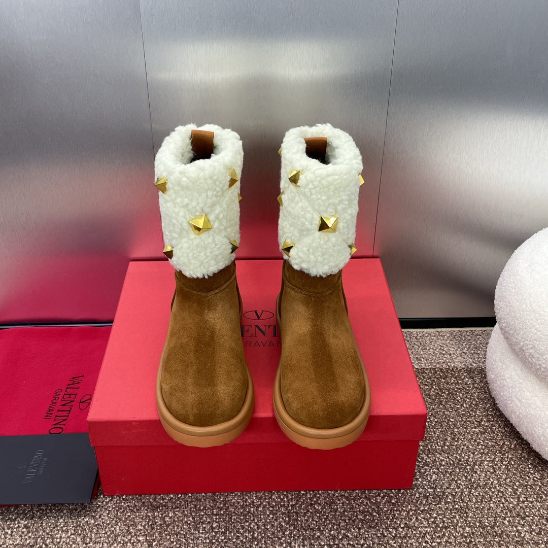 ANKLE STUDDED BOOTS IN SEPIA BROWN SUEDE AND WHITE SHEARLING LINING