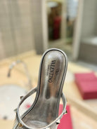 ROCKSTUD MULE SANDALS IN SILVER CALFSKIN AND TRANSPARENT PVC FILM