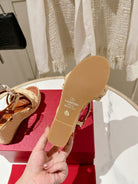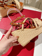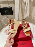 Valentino Garavani Taupe Wedge Rockstud Sandals 10mm In Bronze Brown Calfskin And Beige Raffia 829384