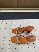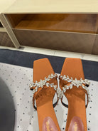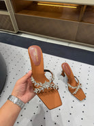 HIGH RHINESTONE CROSS STRAP MULES IN BRONZE BROWN SILK