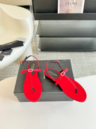 SL CRYSTAL T-STRAP FLAT SANDAL RED SATIN