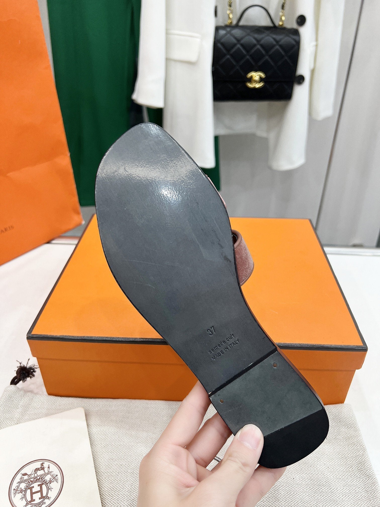 - Material: Sandal in velvet goatskin with iconic "H" cut-out.