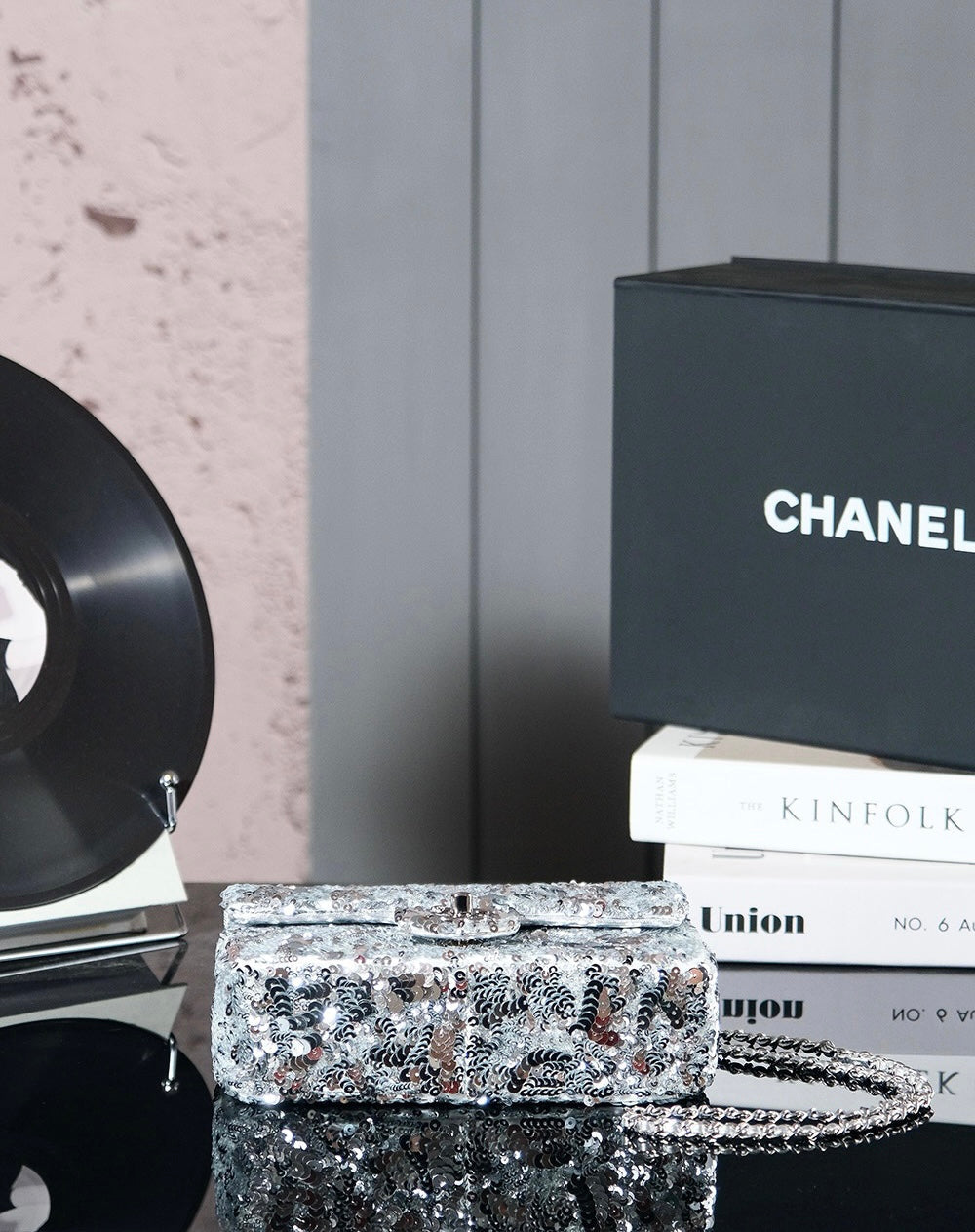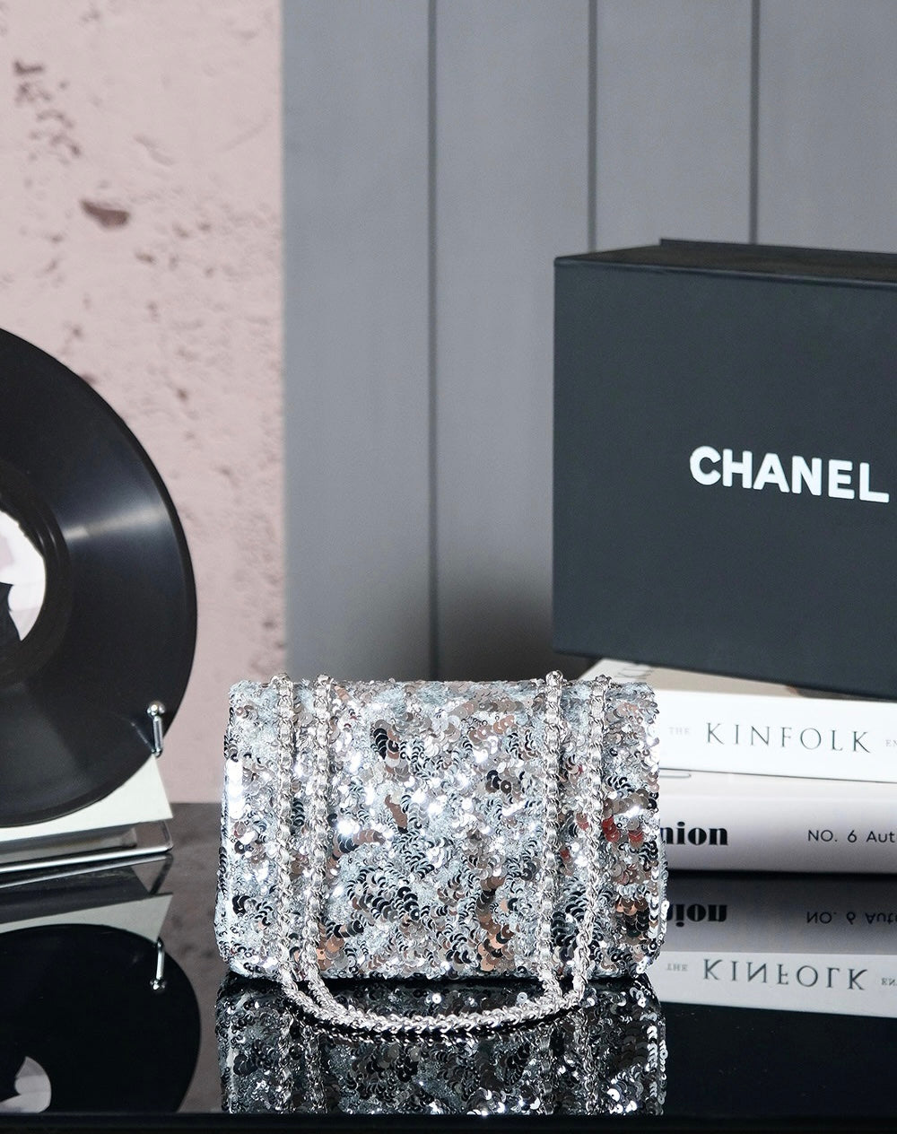 25C Flap Bag 21cm Dense Silver Sequin White Calfskin