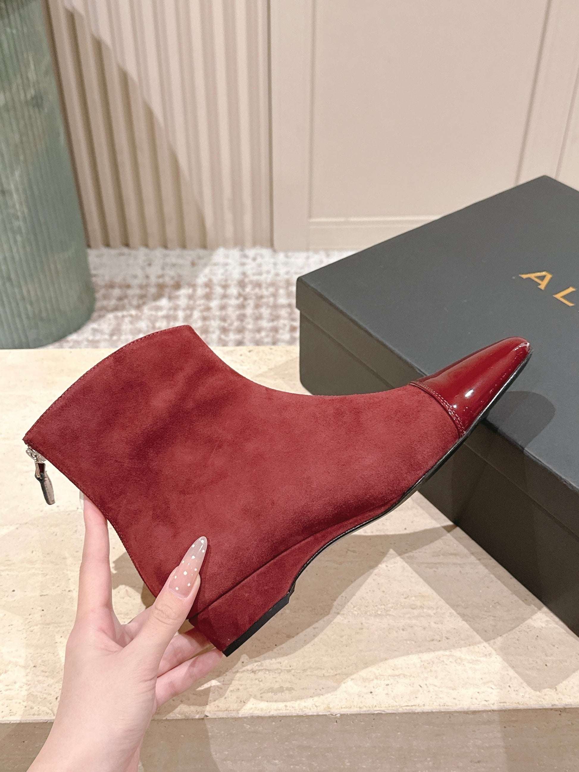 Alaia 2025 Ankle Boot With Patent Leather Cap Toe Red Suede 556088