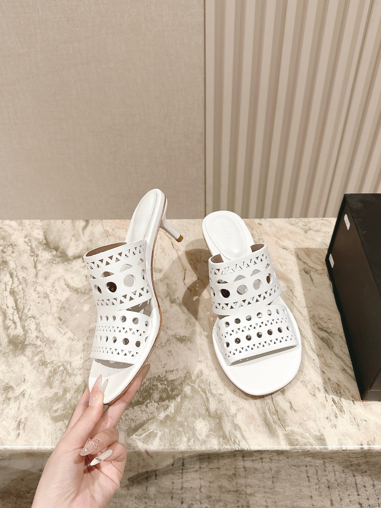 Alaia 2025 Vienne Cutout Kitten-Heel Slide Sandals White Leather 293650