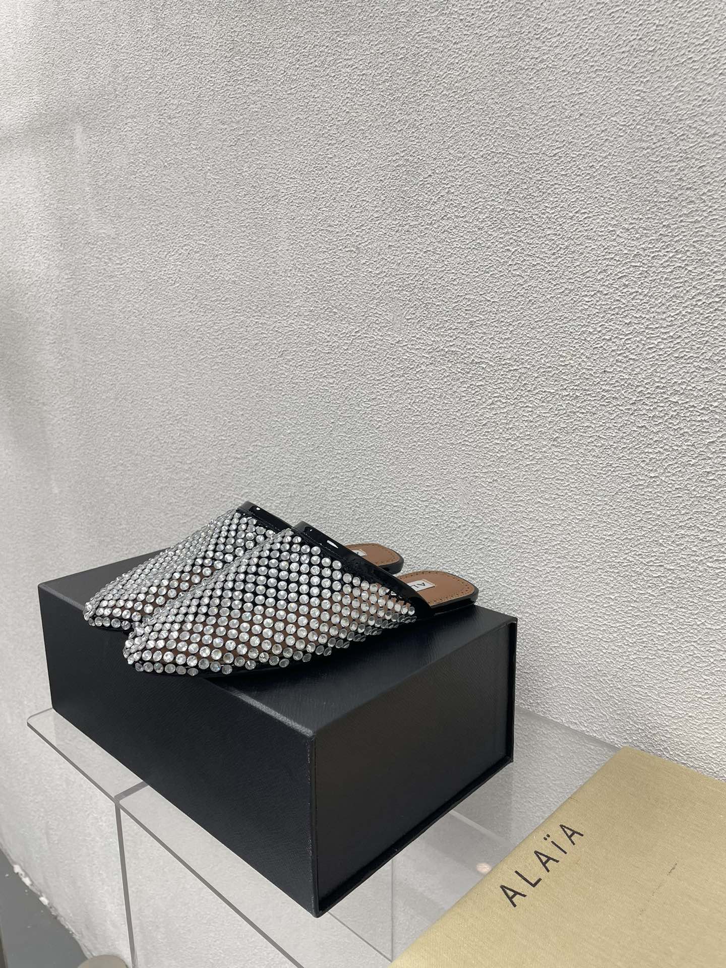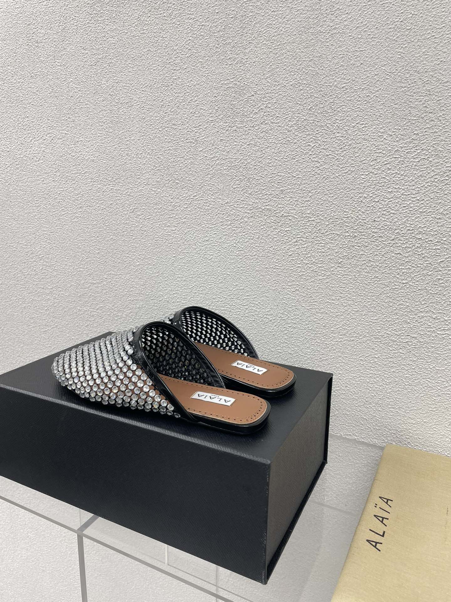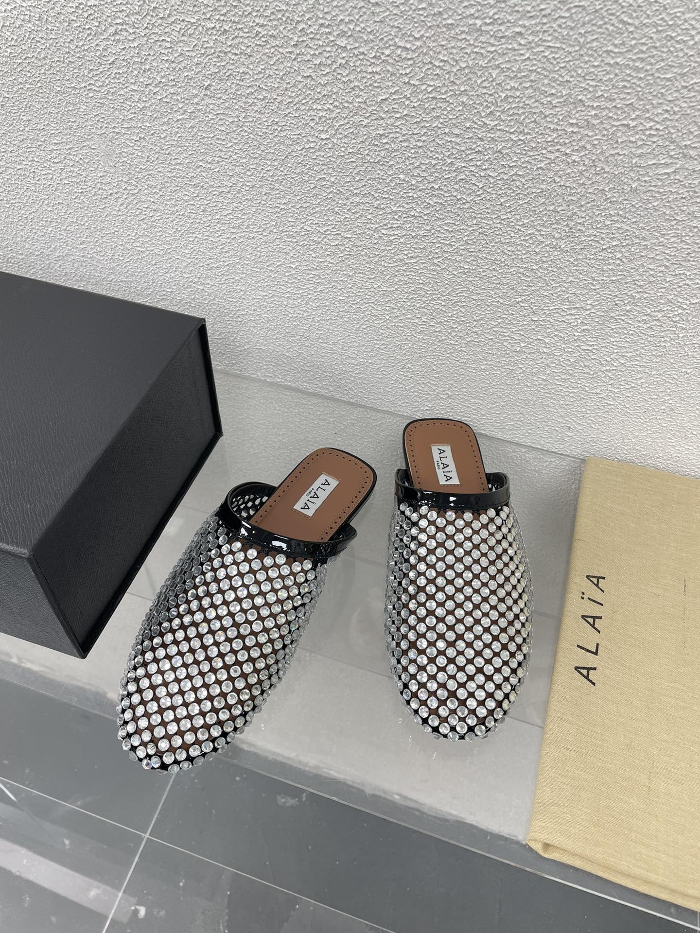 ALAIA FLAT MULES IN STRASS BLACK LAMBSKIN WITH RHINSTONES