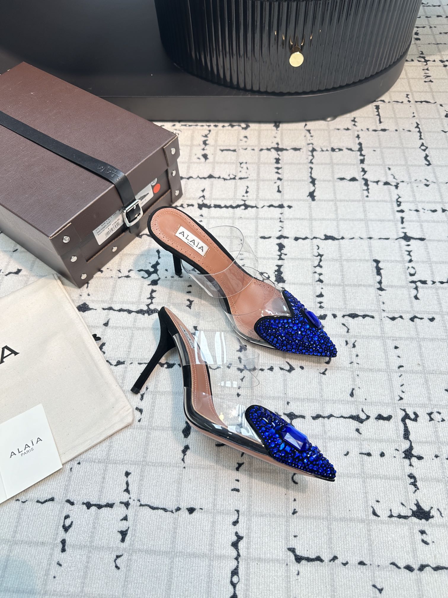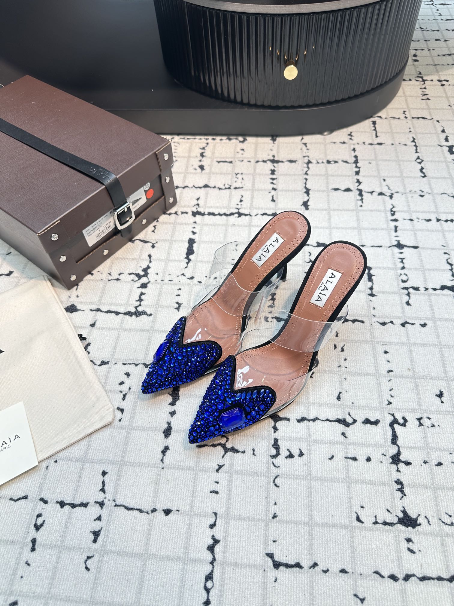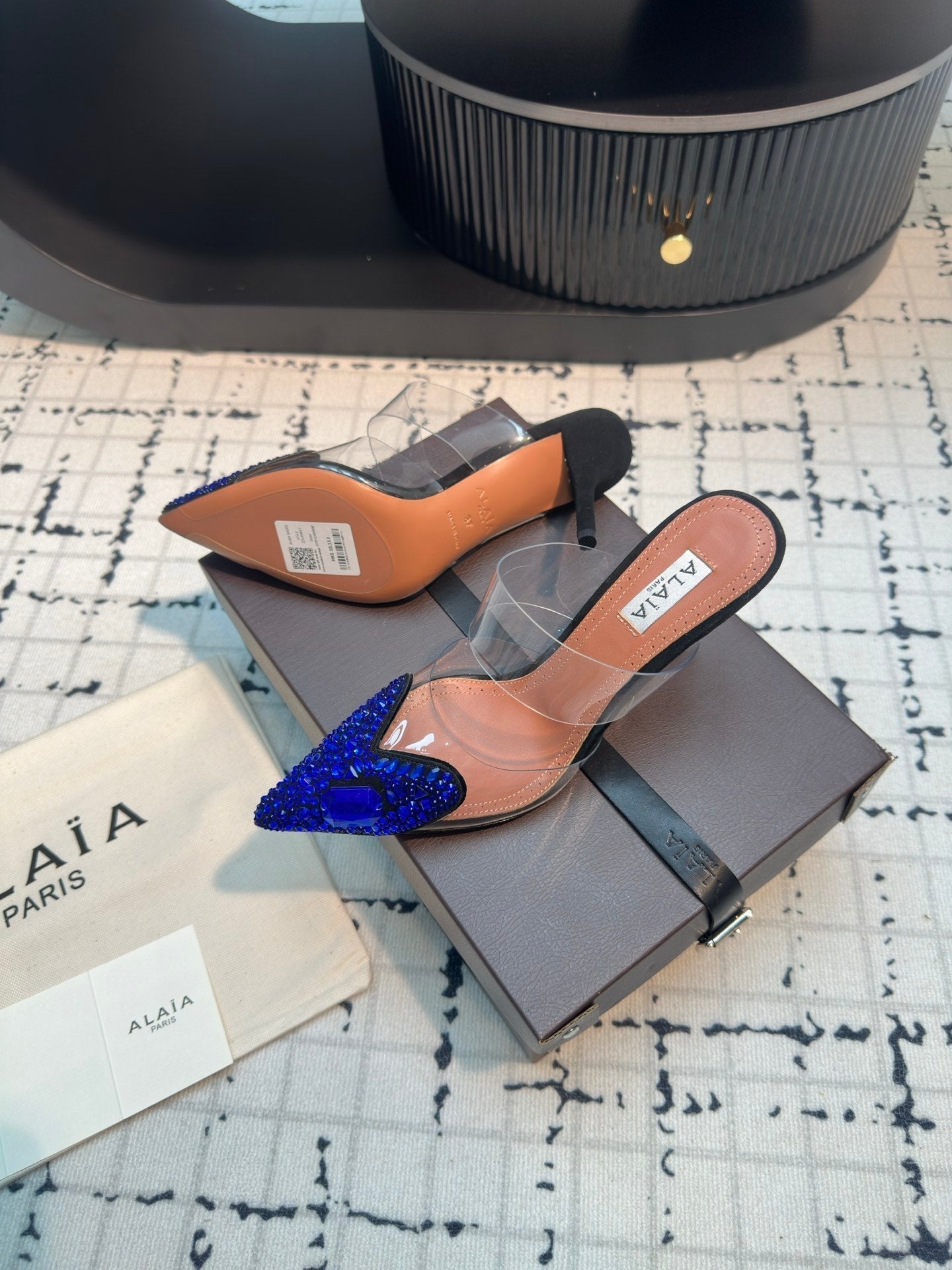 Alaia Heart With Crystals 90mm Heels Mules Dark Blue Sheepskin 800948