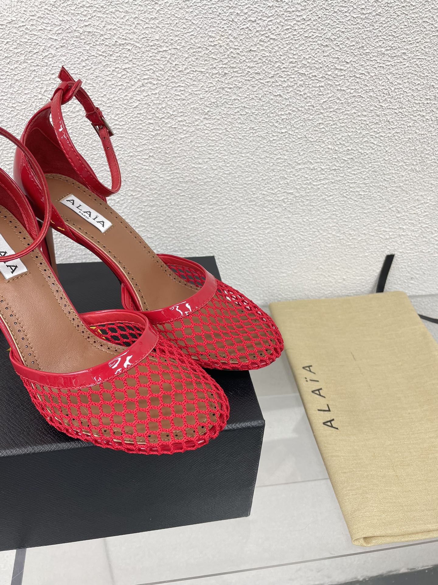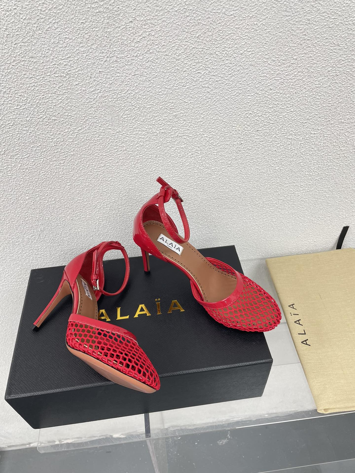 ALAIA HIGH FISHNET 9 CM PUMPS IN CHERRY RED MESH