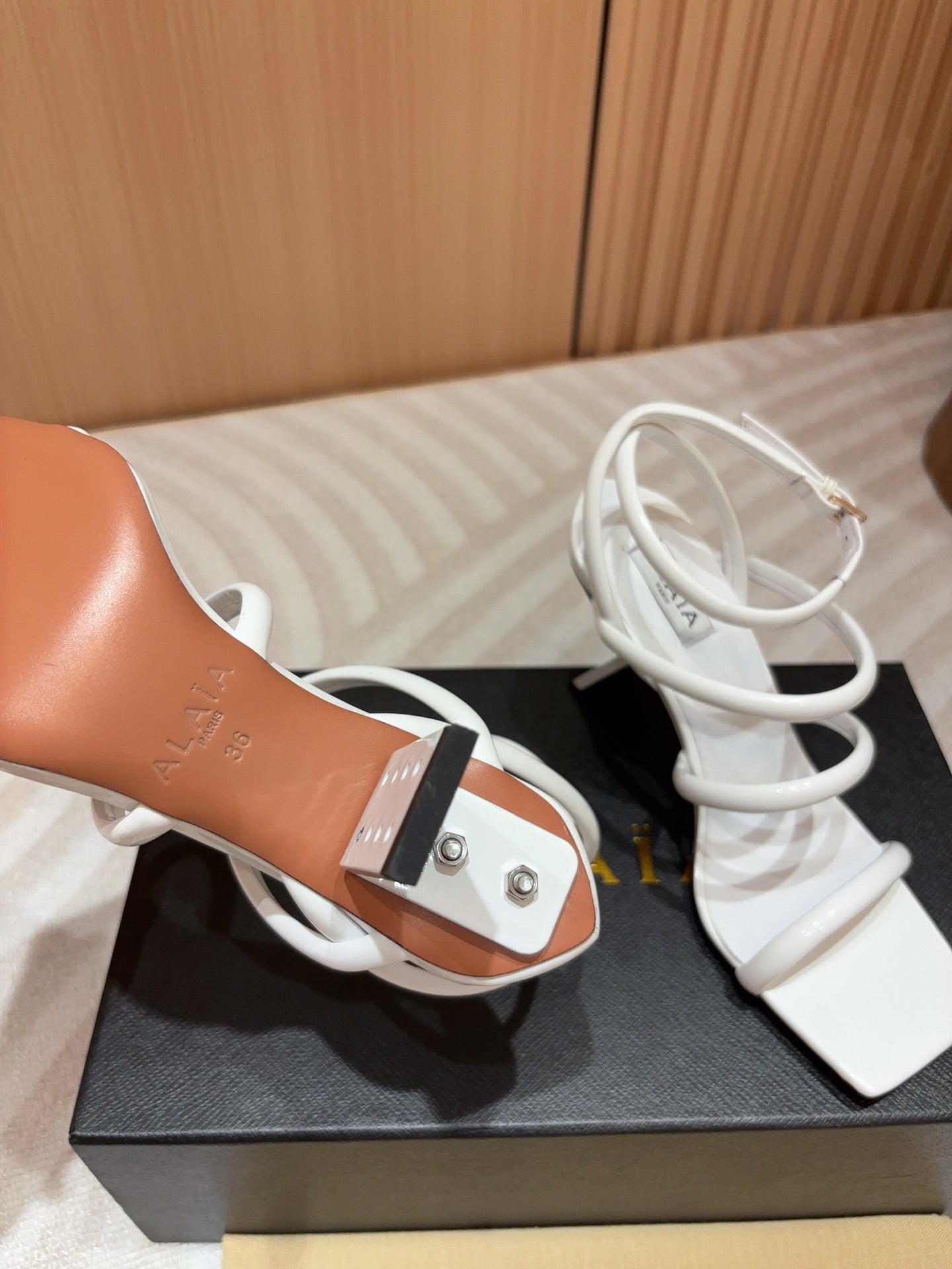 ALAIA THREE-STRAPS HIGH HEEL SANDALS IN WHITE PATENT LAMBSKIN