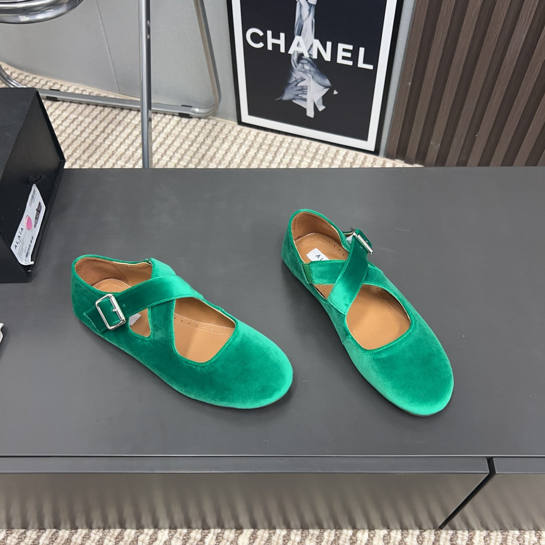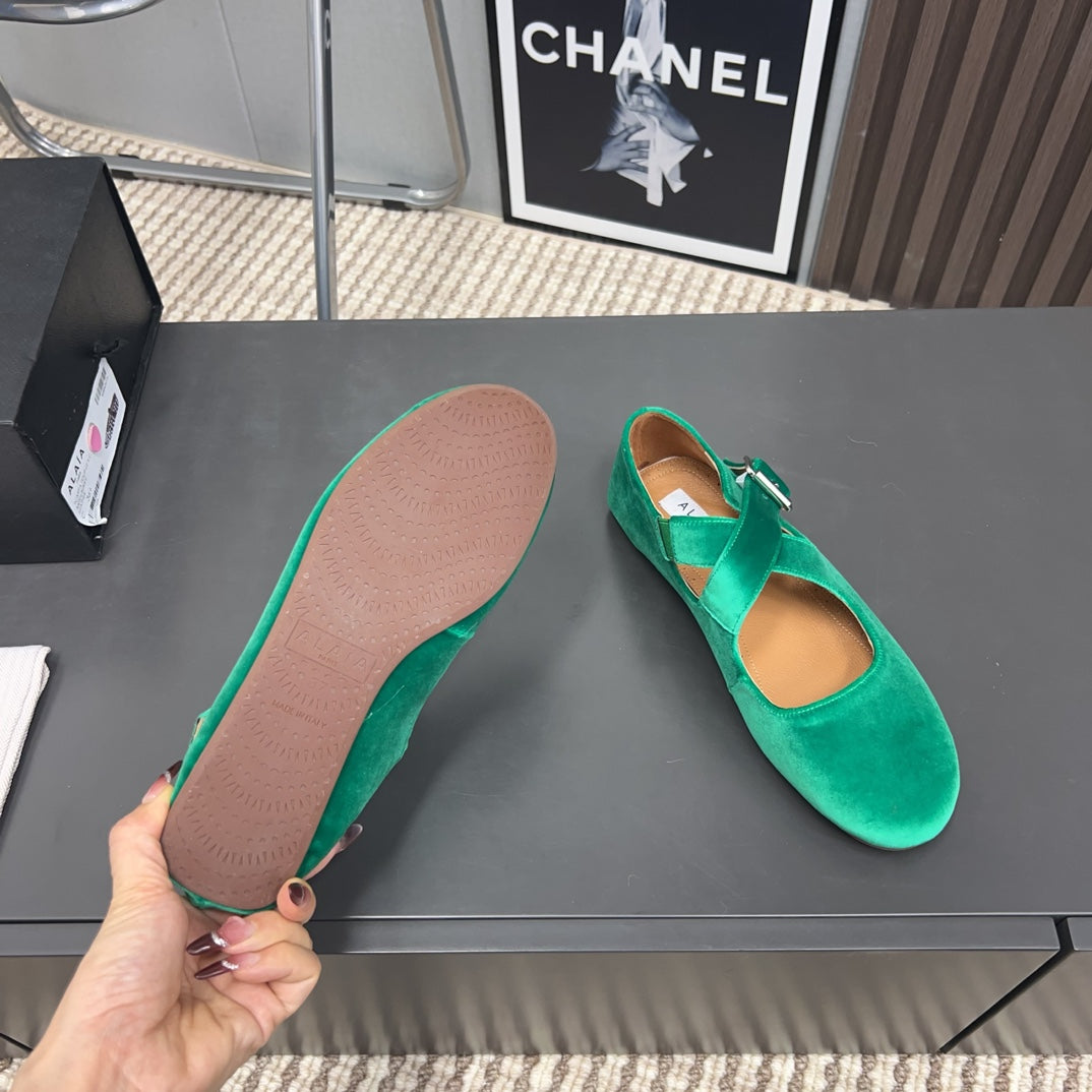Alaila Criss Cross Ballet Flats In Green Velvet 996047