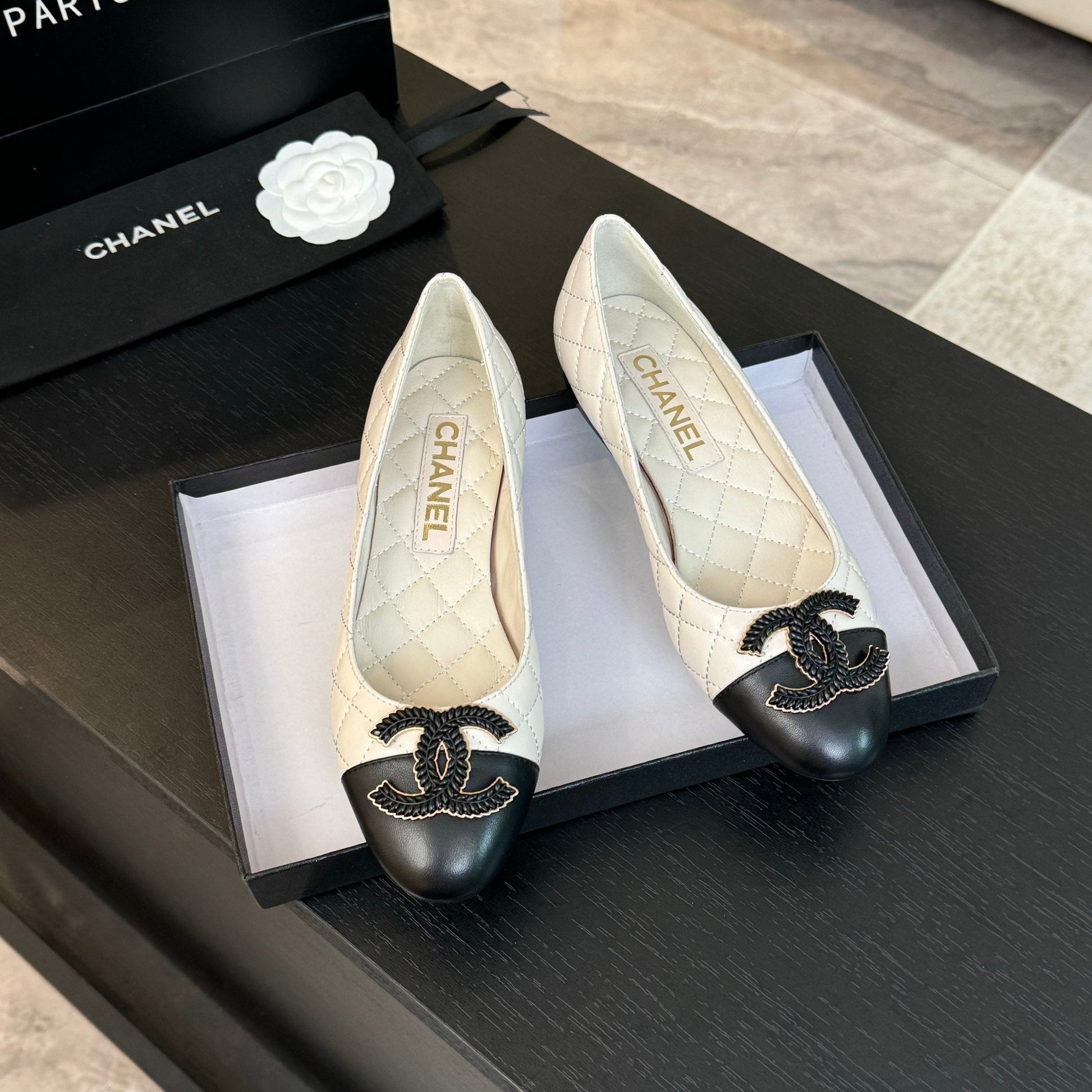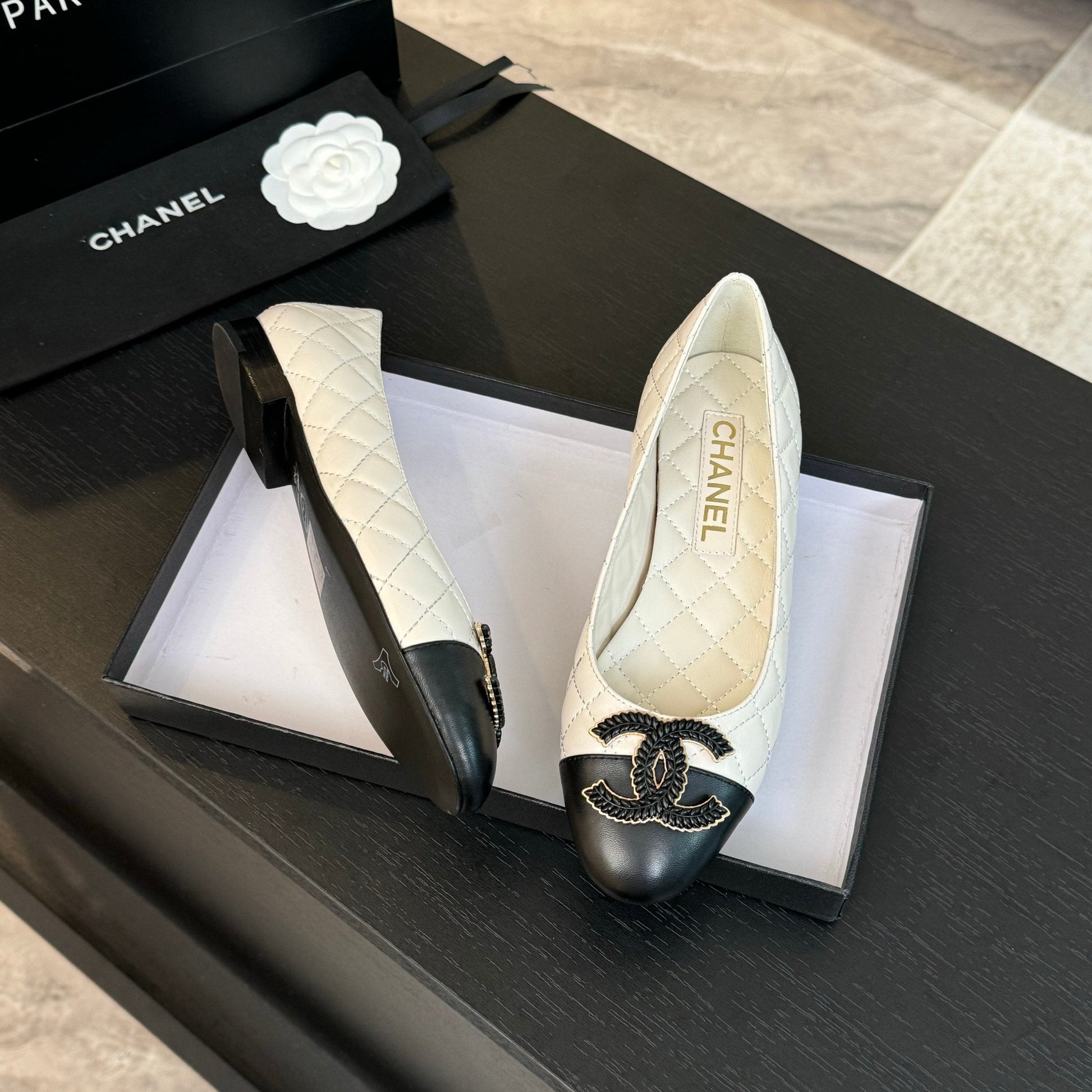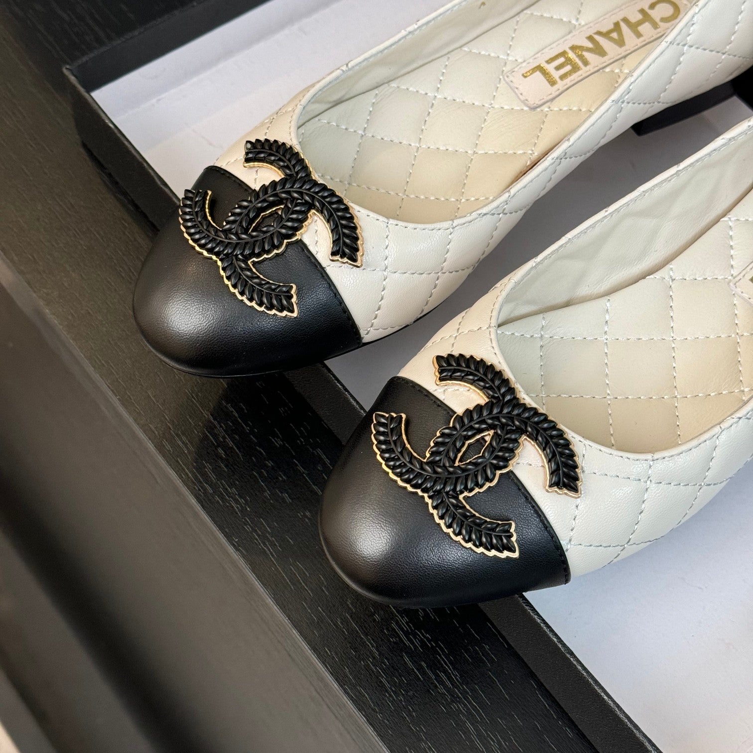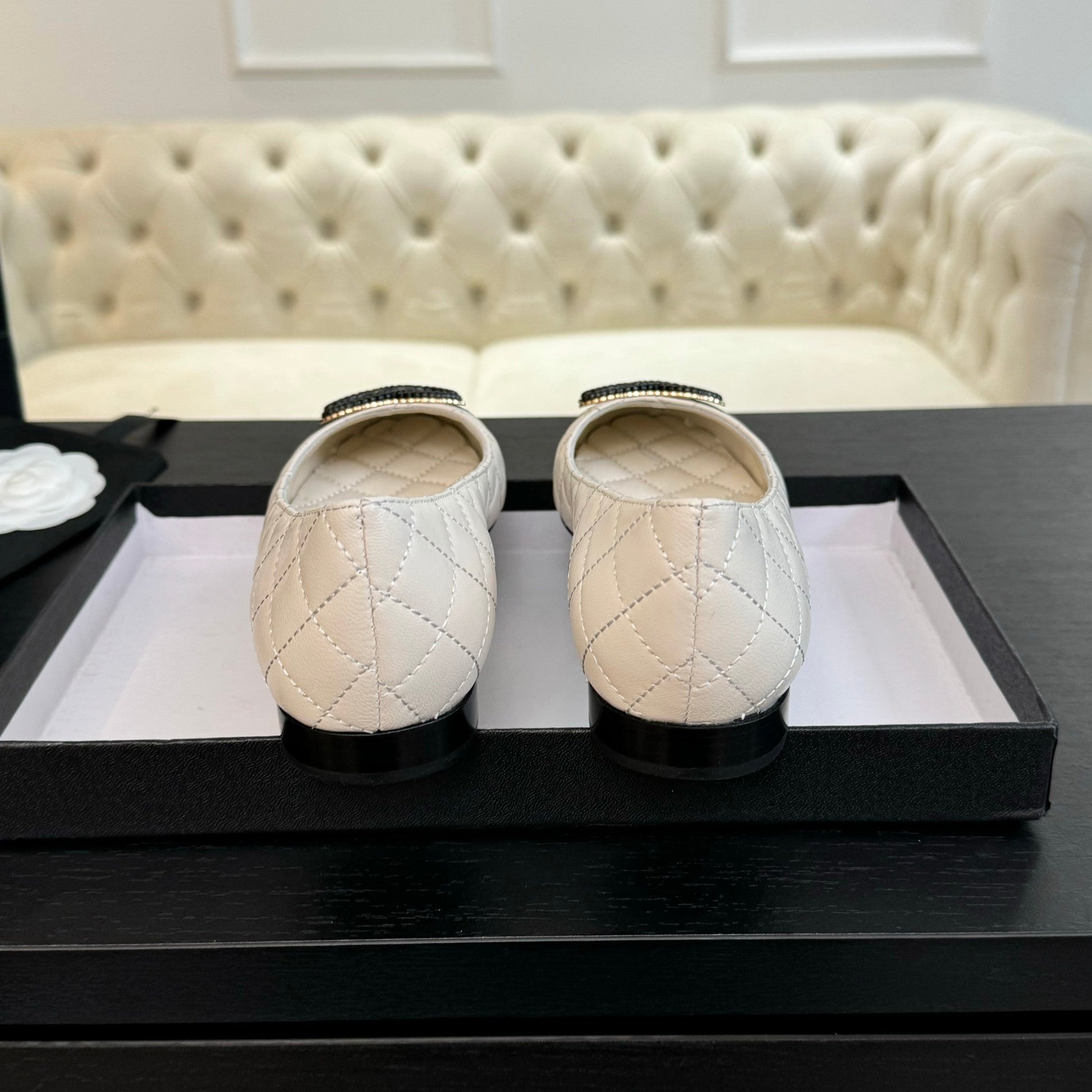 ballet flat white quilted lambskin large black cc logo