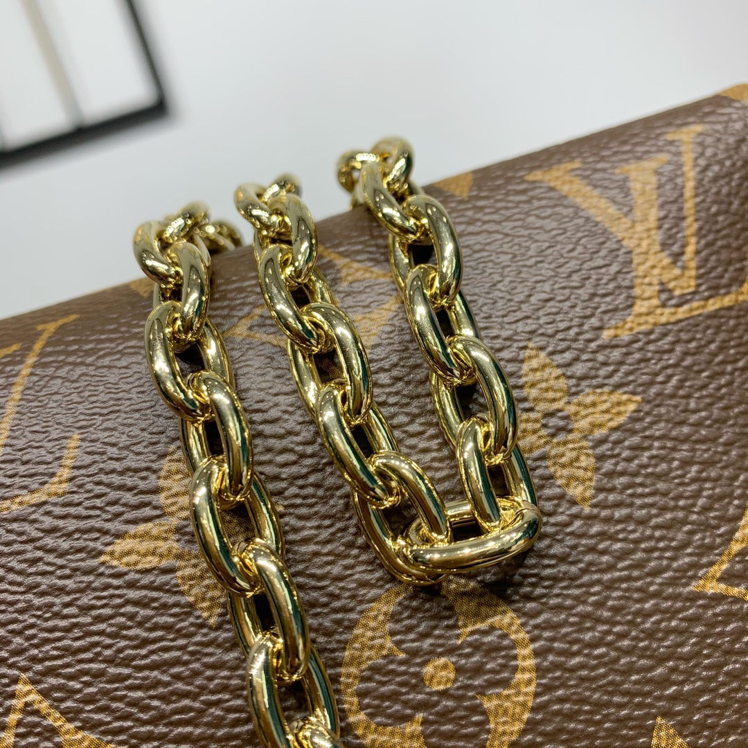 BLOOM POUCH 22 IN BROWN MONOGRAM CANVAS AND PASTEL PINK CALFSKIN SIDES