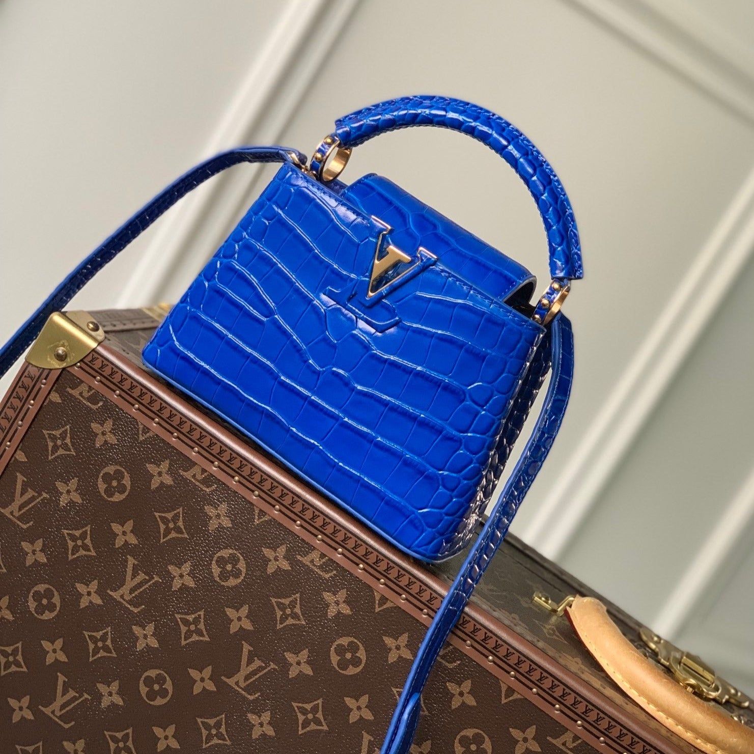 CAPUCINES MINI 21 COBALT BLUE CROCODILE EMBOSSED CALFSKIN GOLD HARDWARE