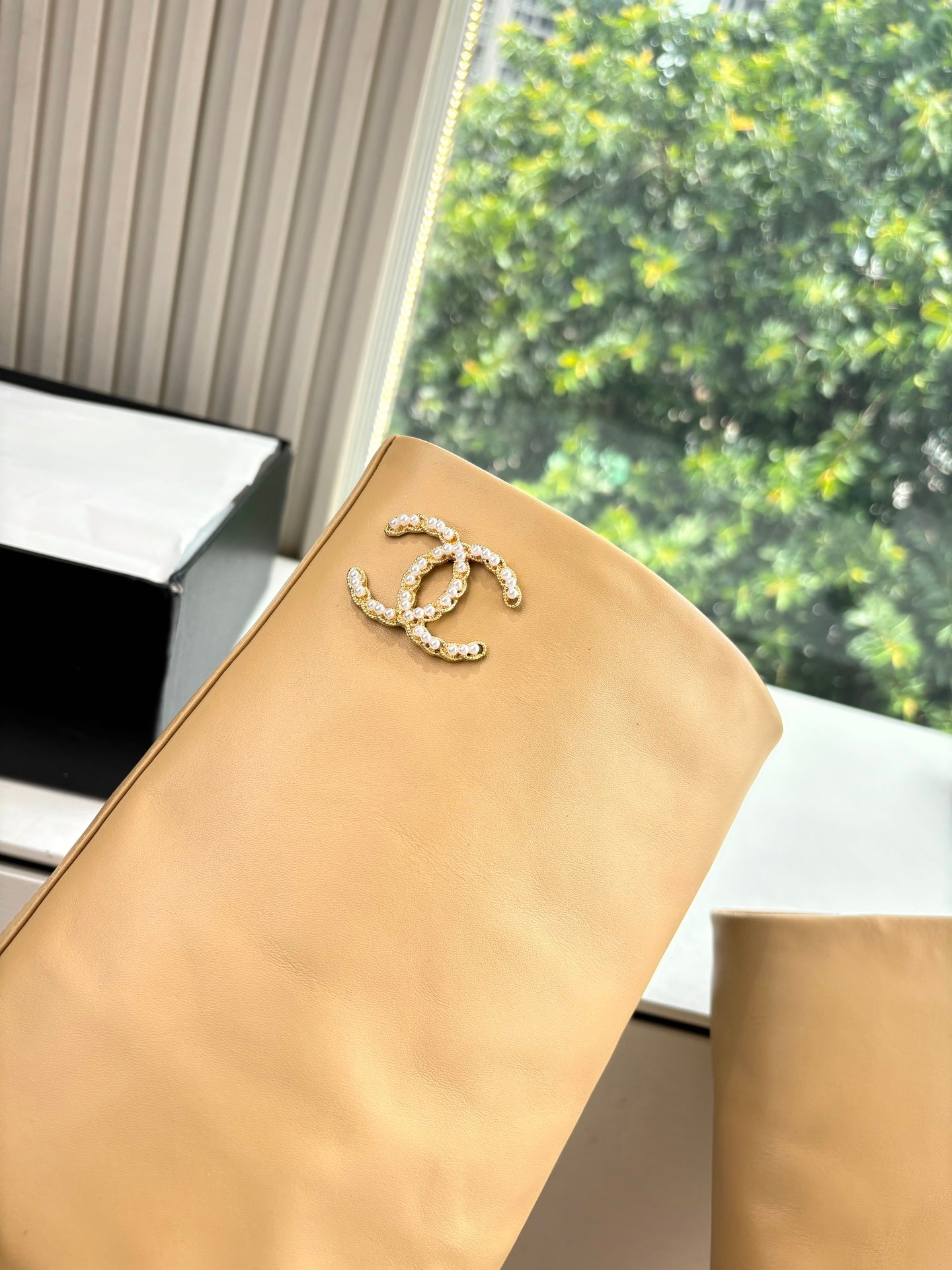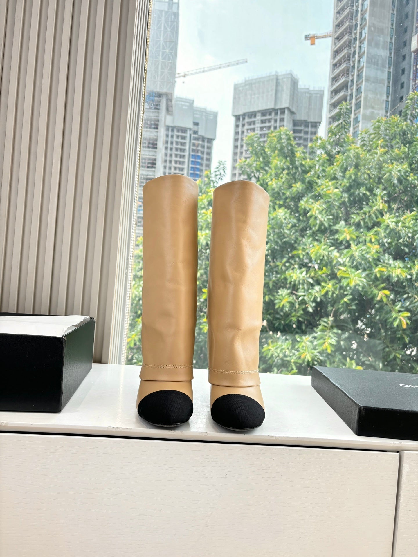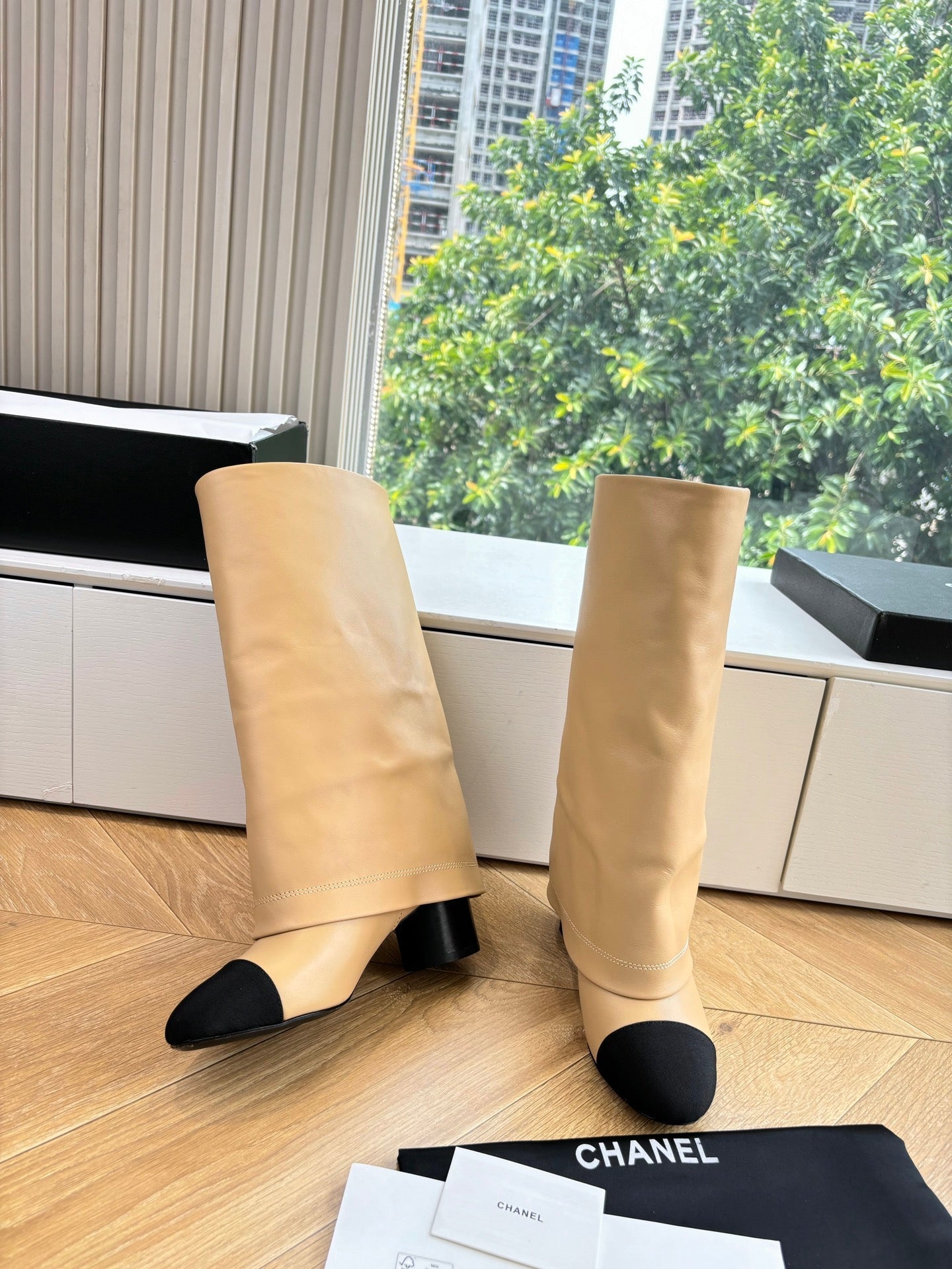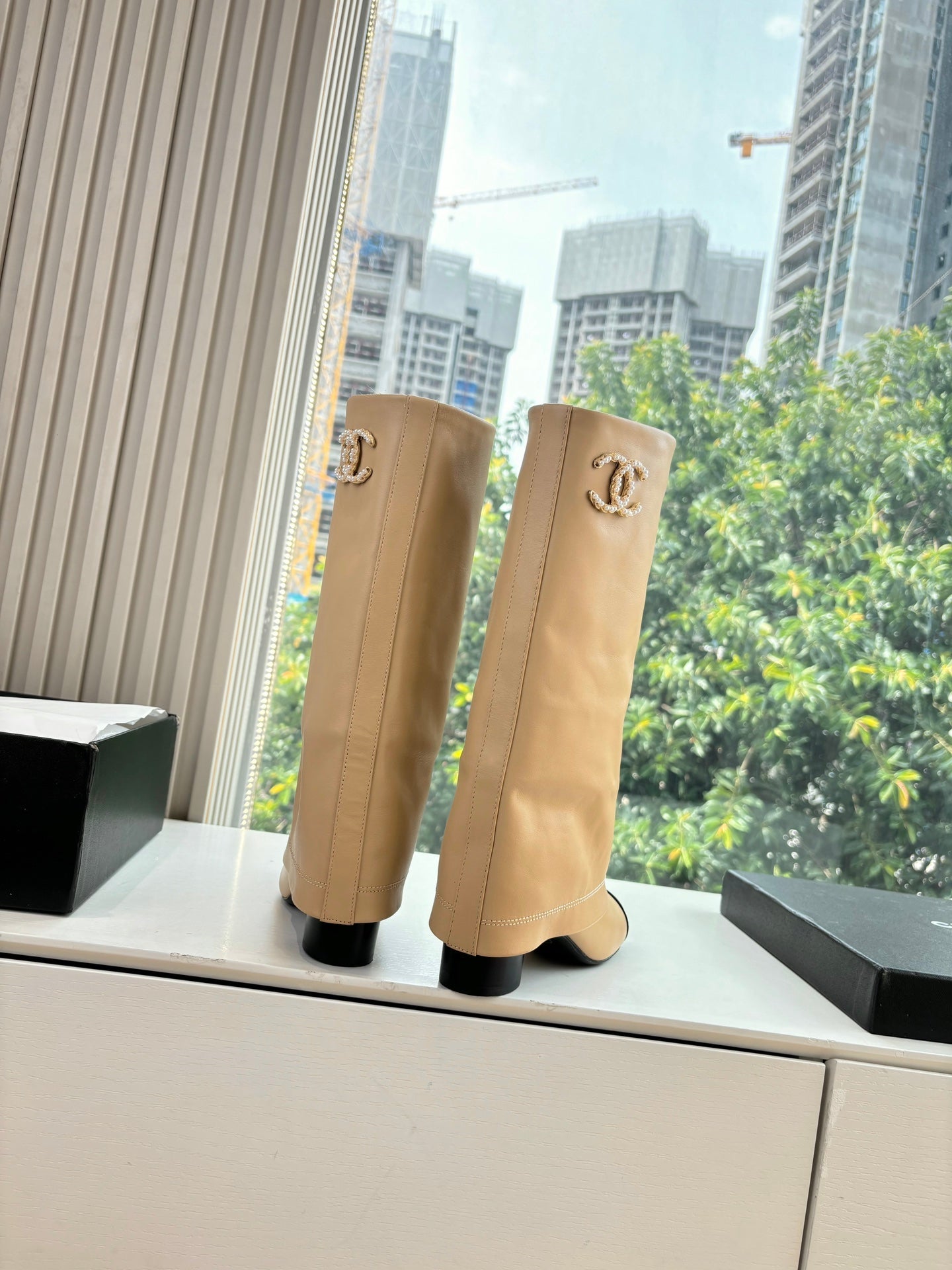 CC 25 High Boot Beige Calfskin Black Grosgrain 430337