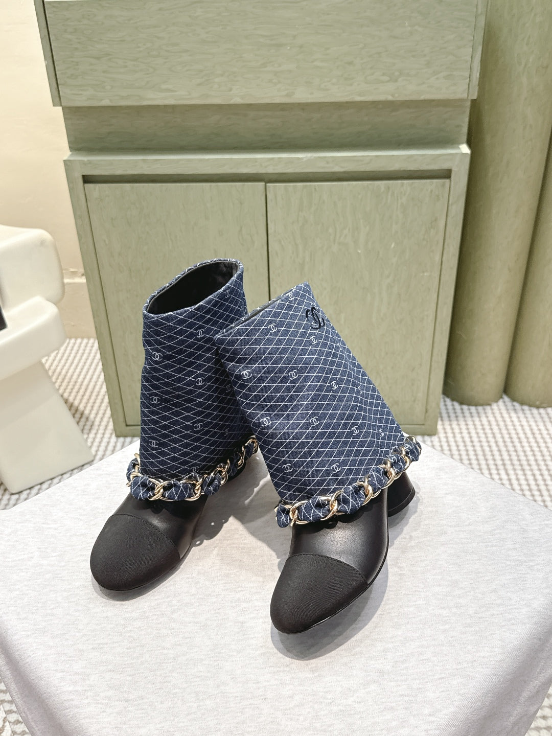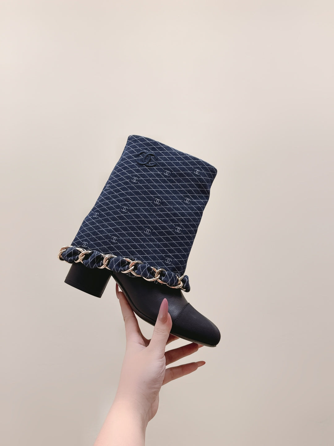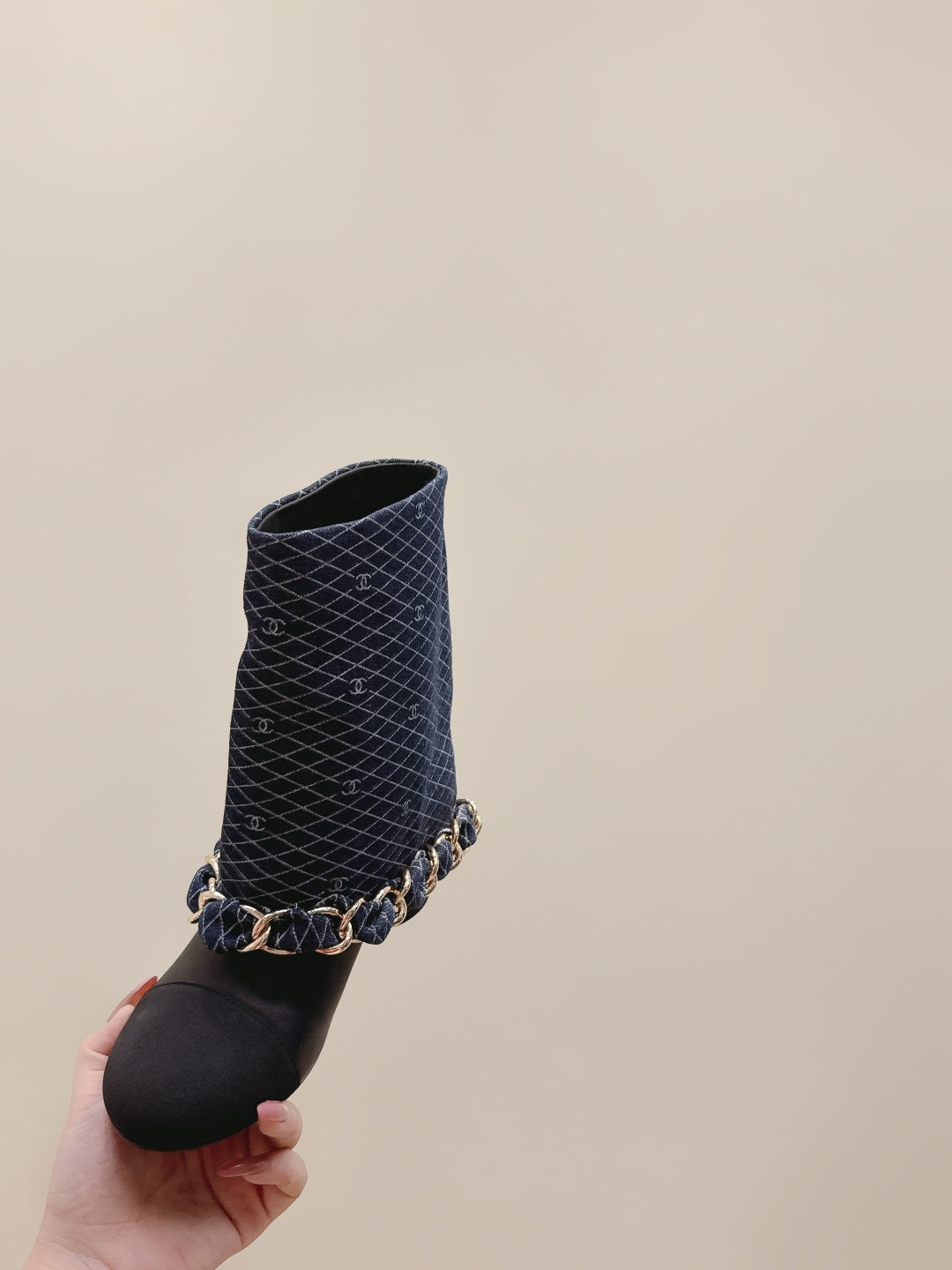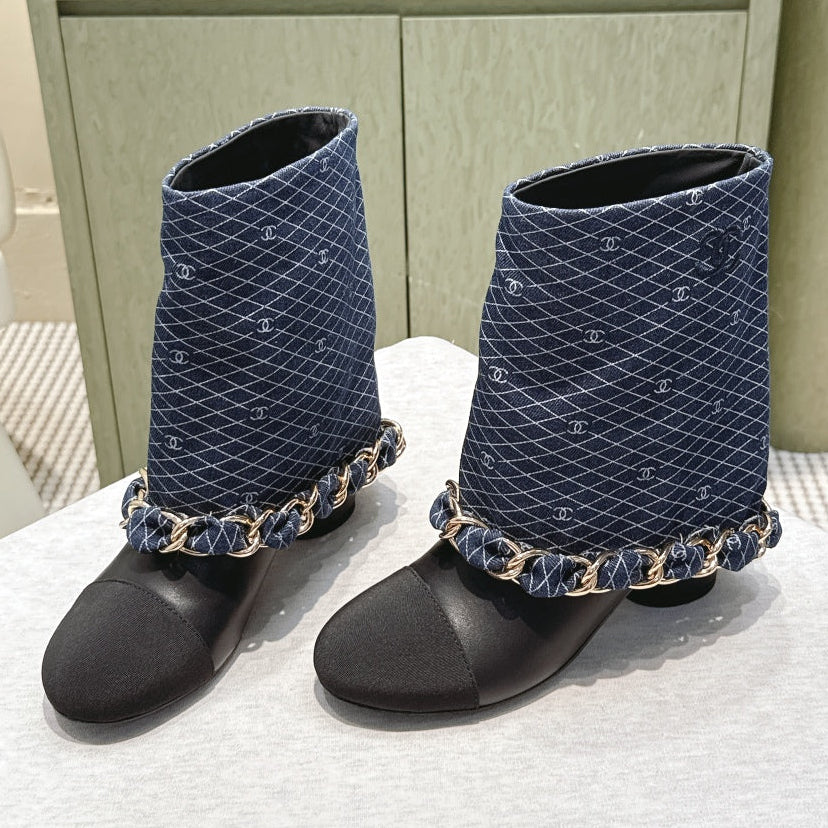 CC 25 Short Boot Navy Blue Black Denim Fabric Calfskin 515266