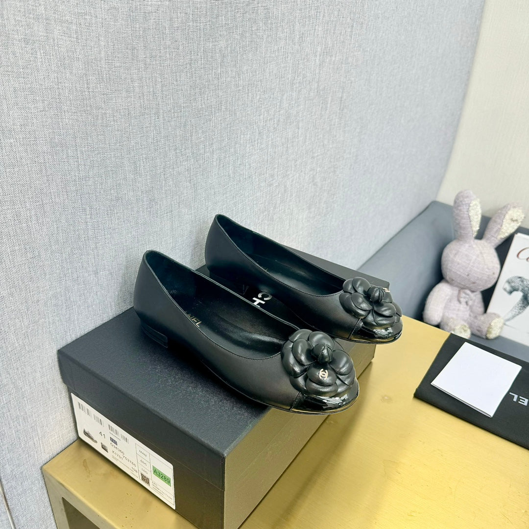 CC 25P Ballet Flat Flower Black Calfskin Patent Calfskin