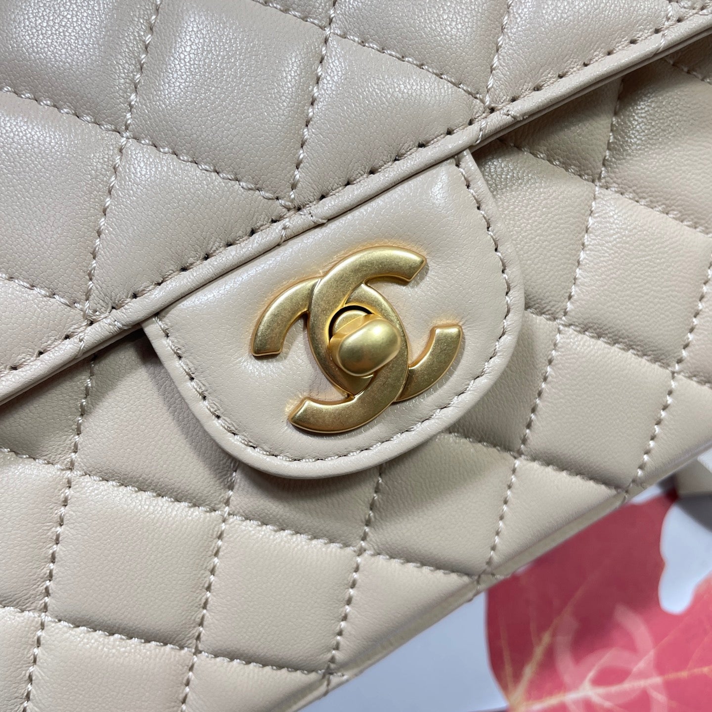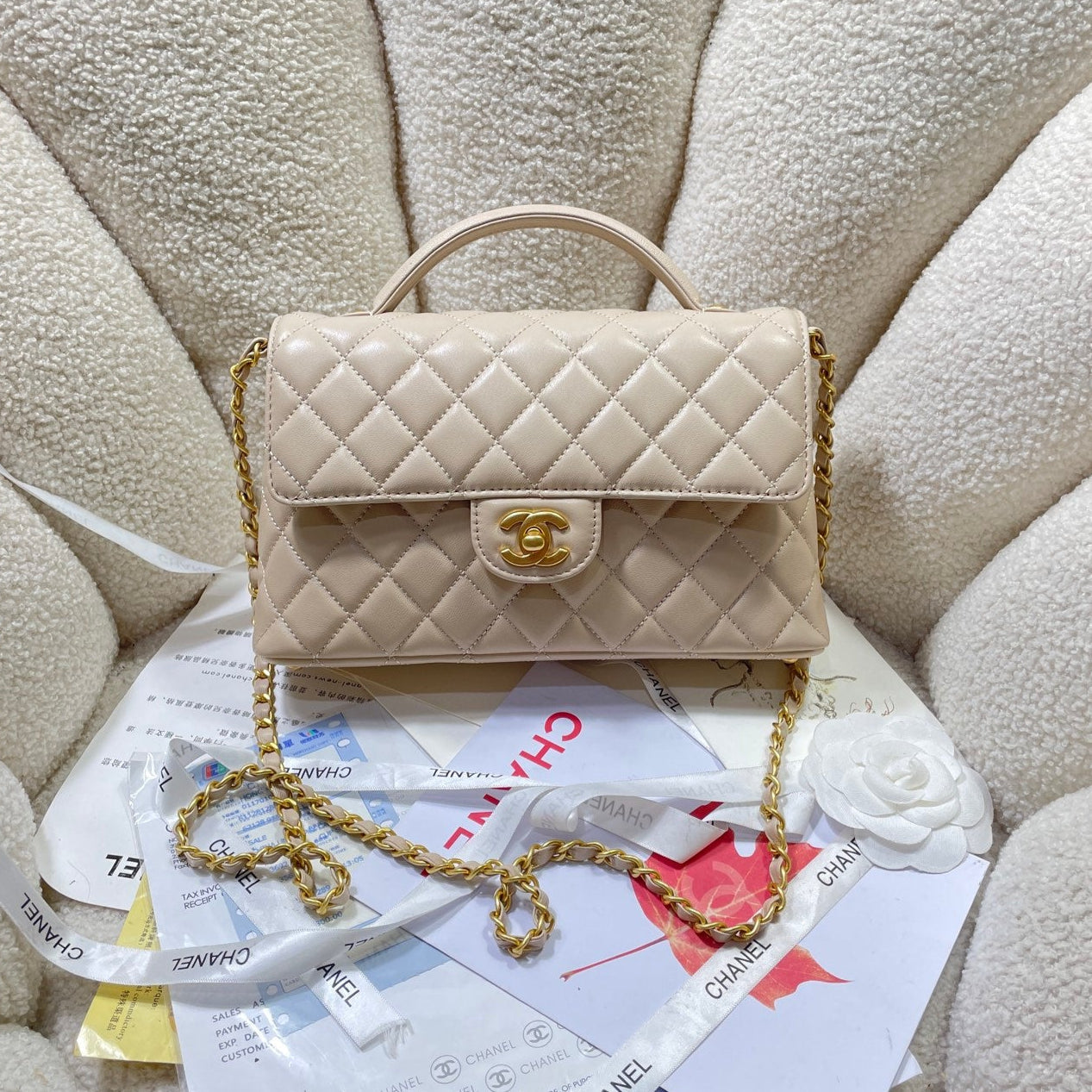 CC 25P Medium Flap Bag 25cm Top Handle Beige Calfskin Gold Hardware