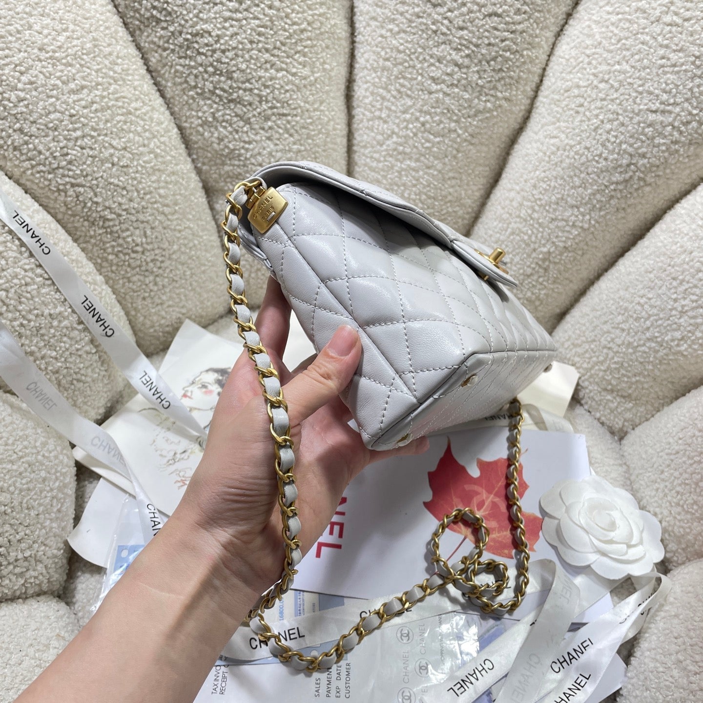 CC 25P Medium Flap Bag 25cm Top Handle Grey Calfskin Gold Hardware