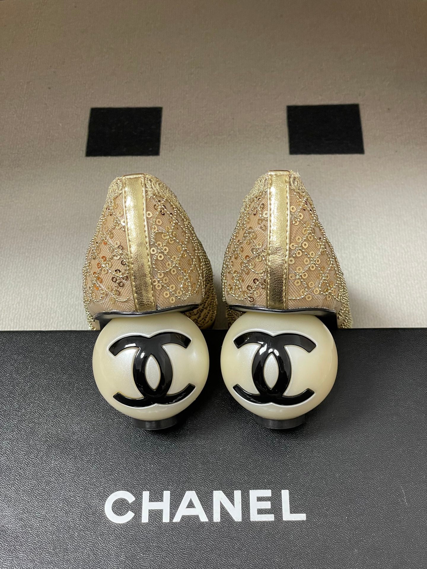 CC 26 Beaded Sequin Pump With Double C Pearl Heel Gold Mesh Leather 593159