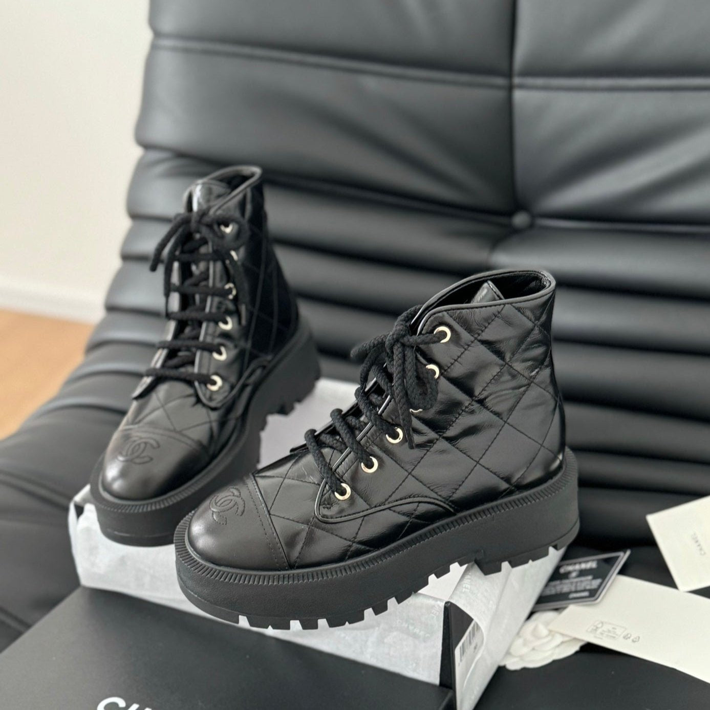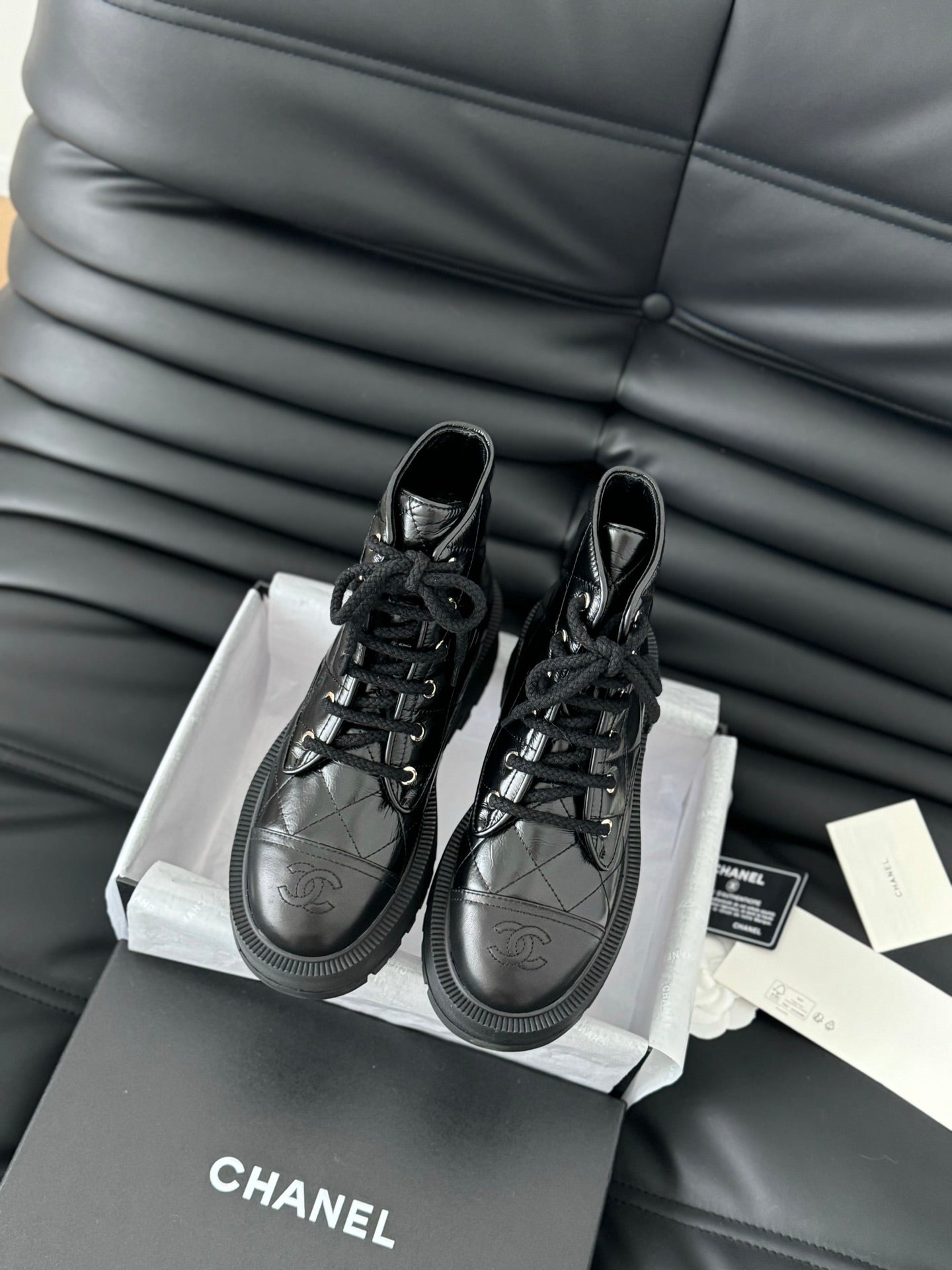 cc ankle boots black quilted patent lambskin