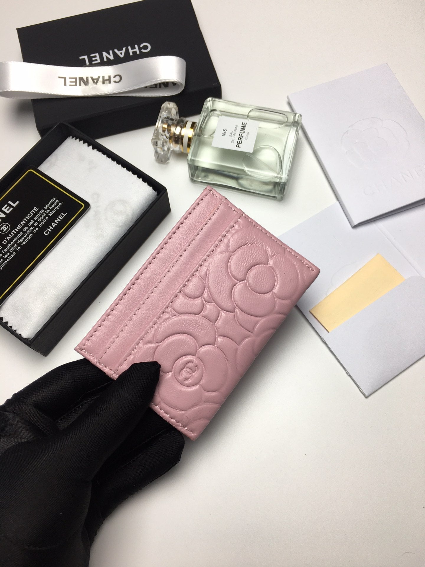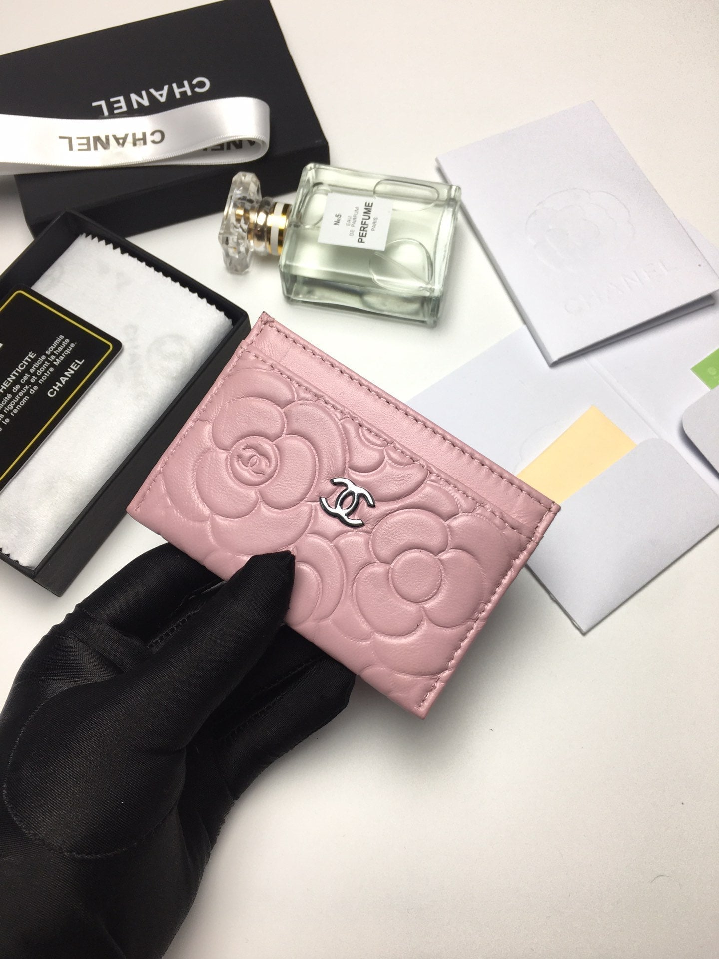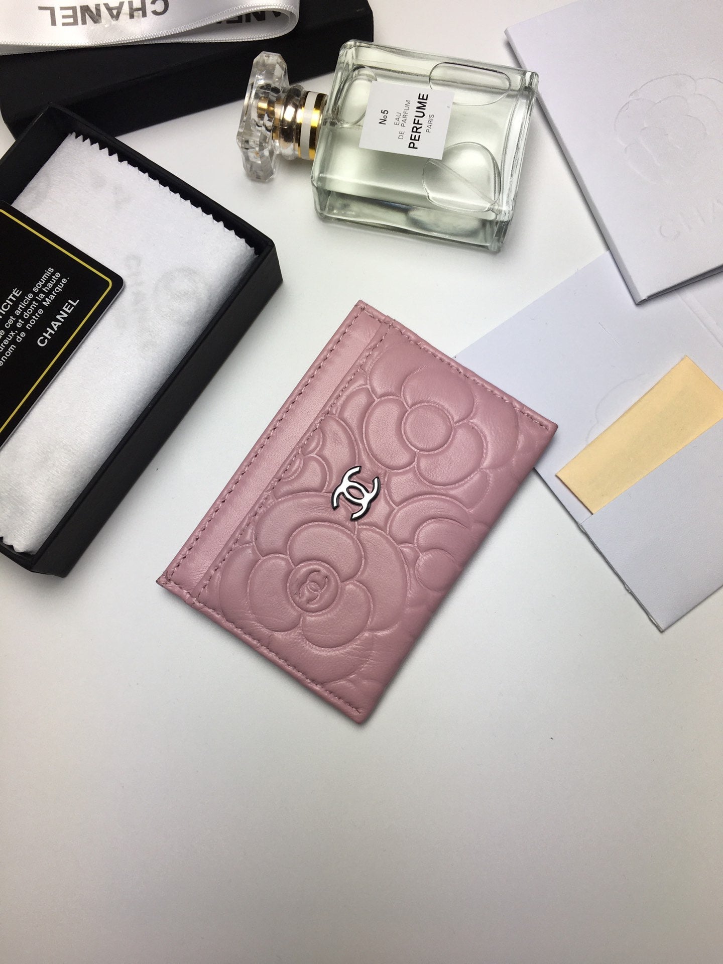 CC FLORAL CARD HOLDER 11.2 BABY PINK CALFSKIN SILVER ICON