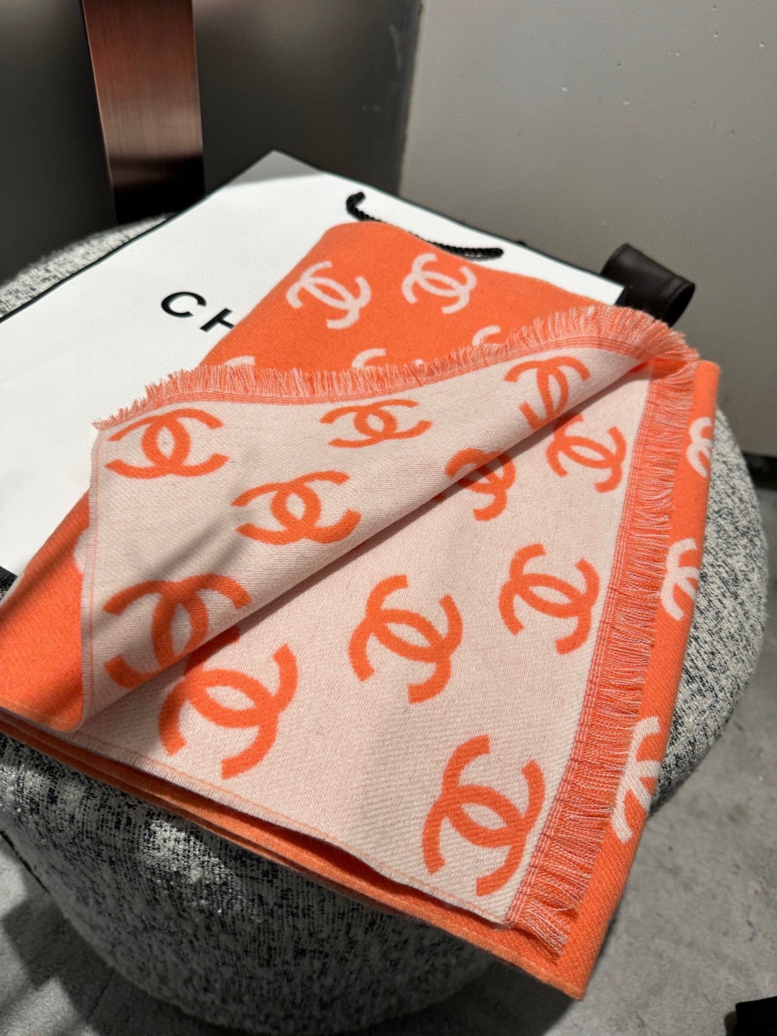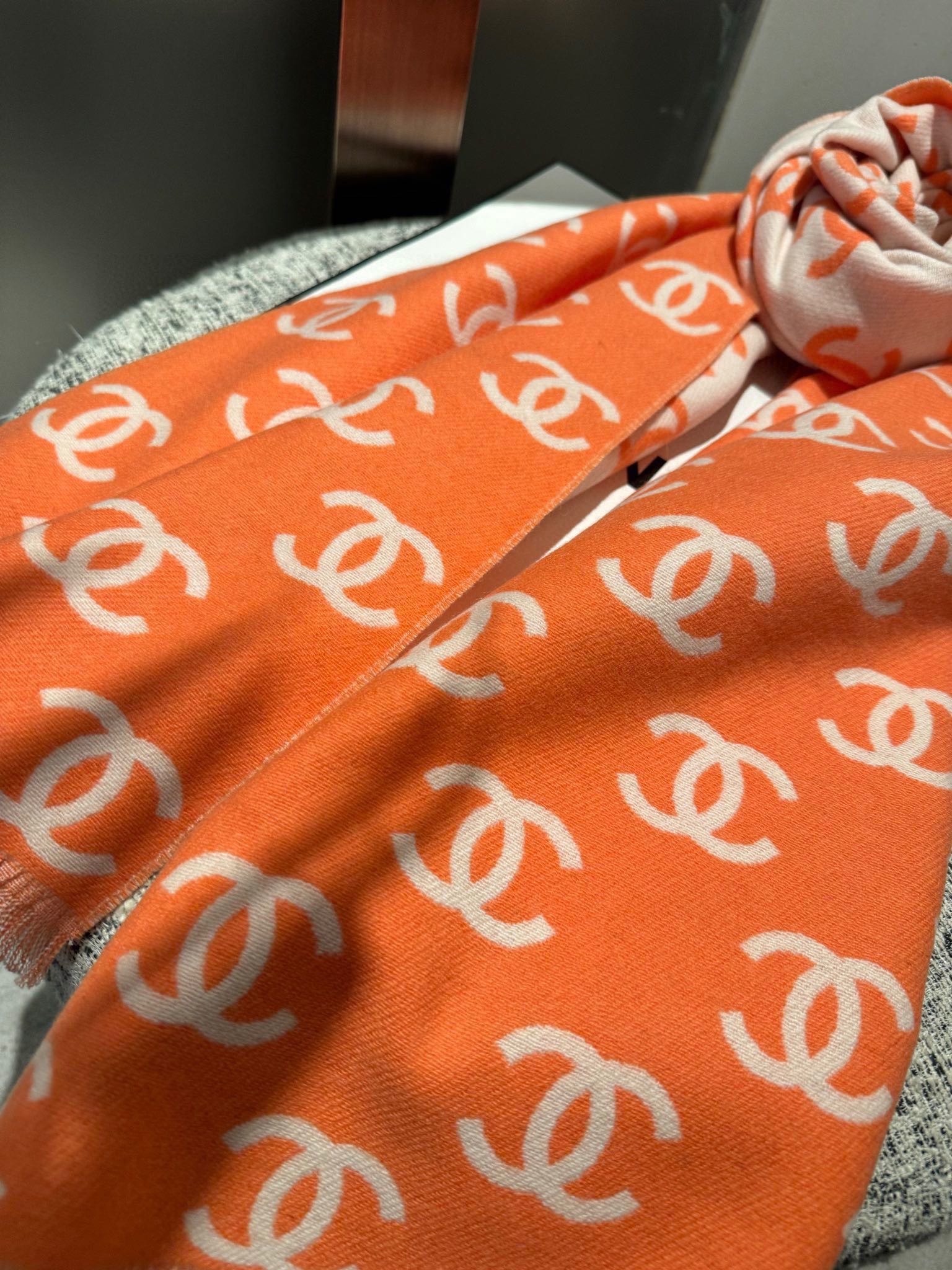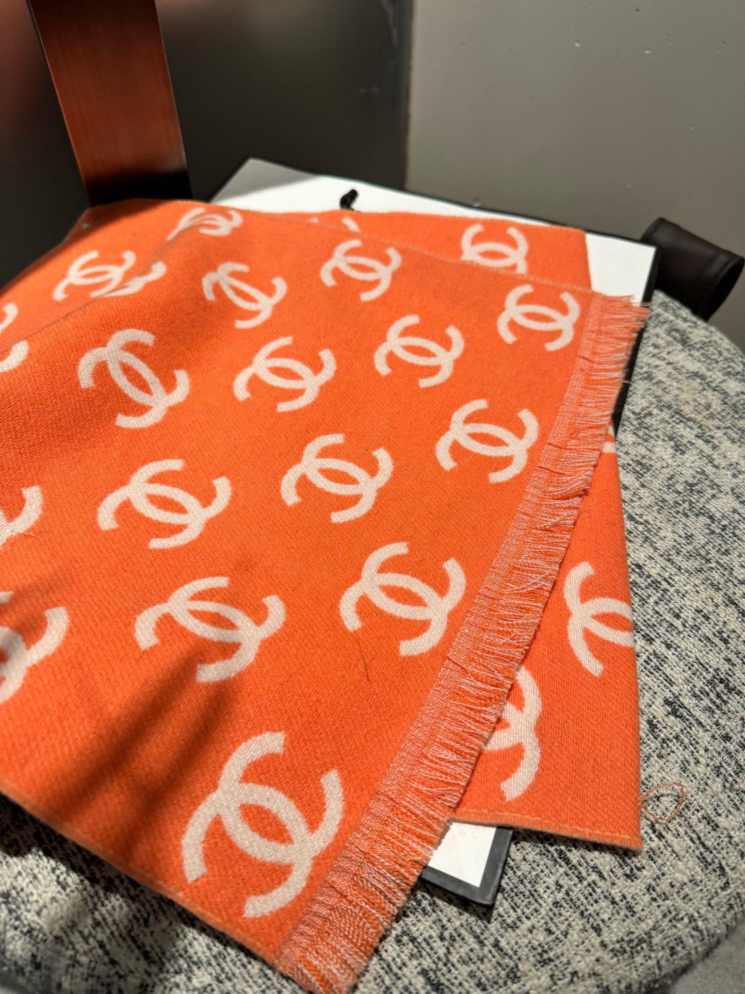 CC Scarf 180 CM In Orange Mix Beige Print Logo Wool And Cashmere 359269