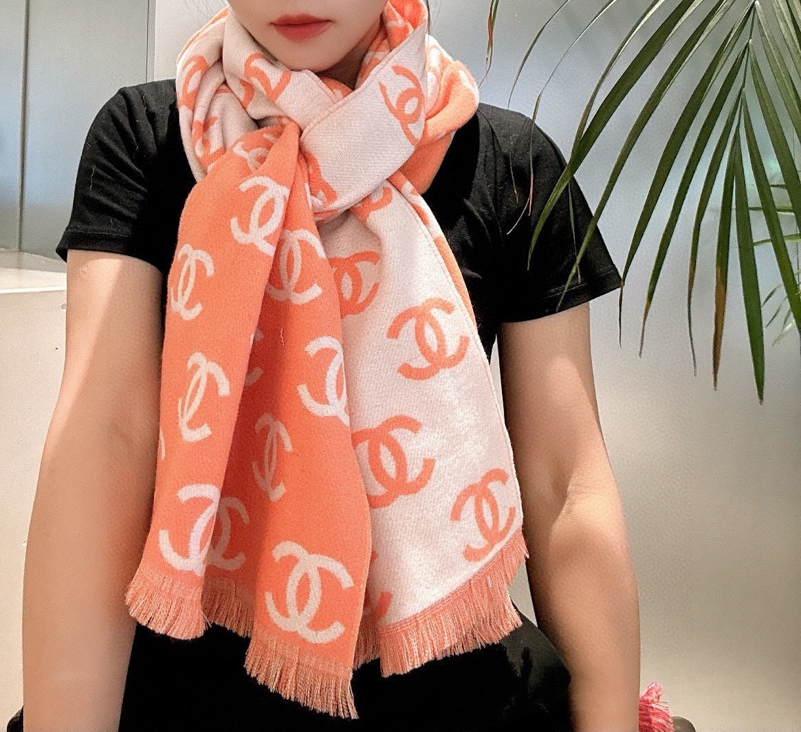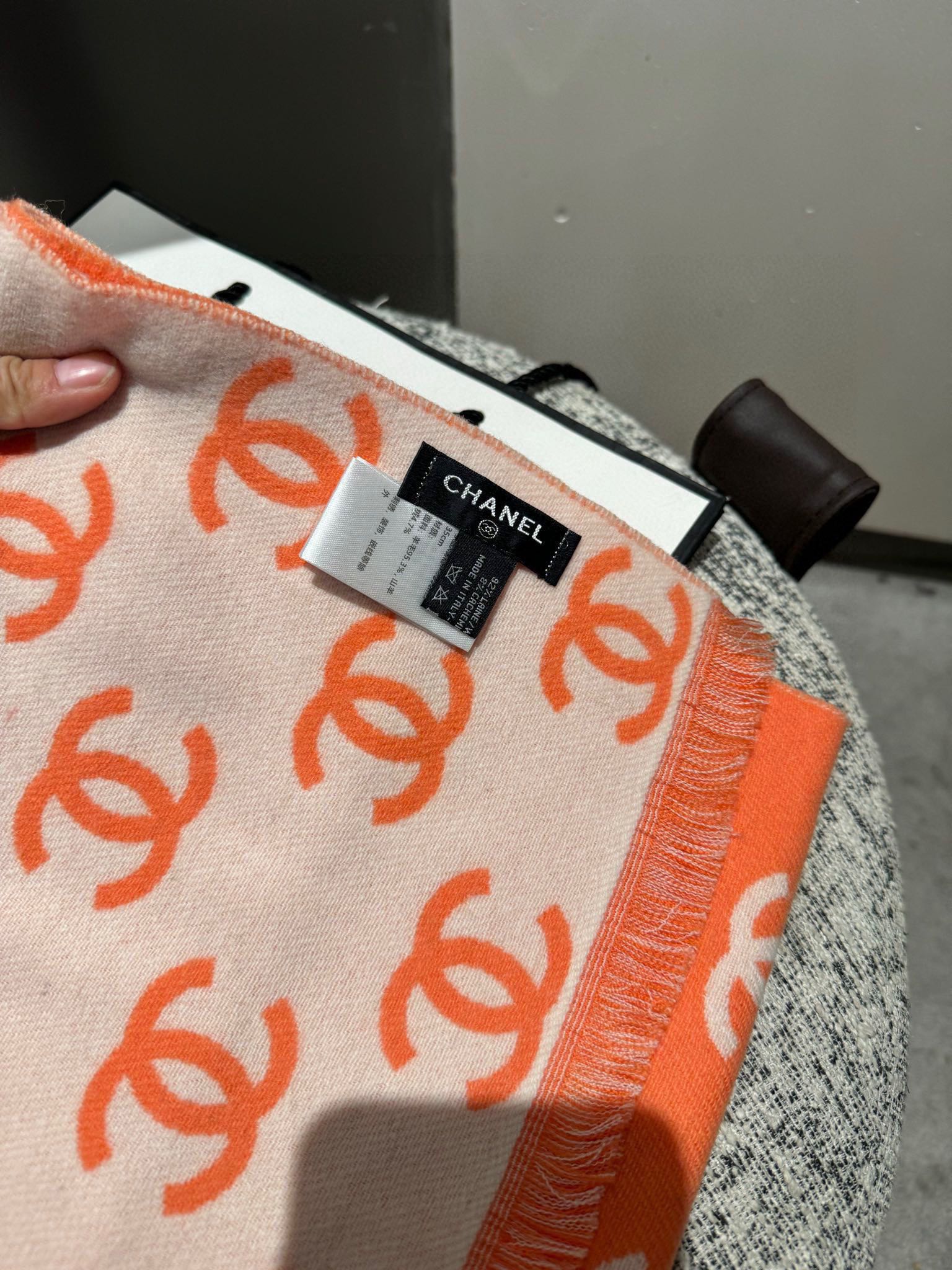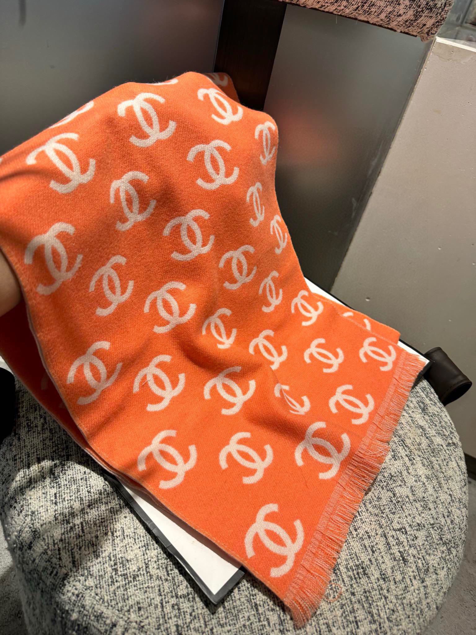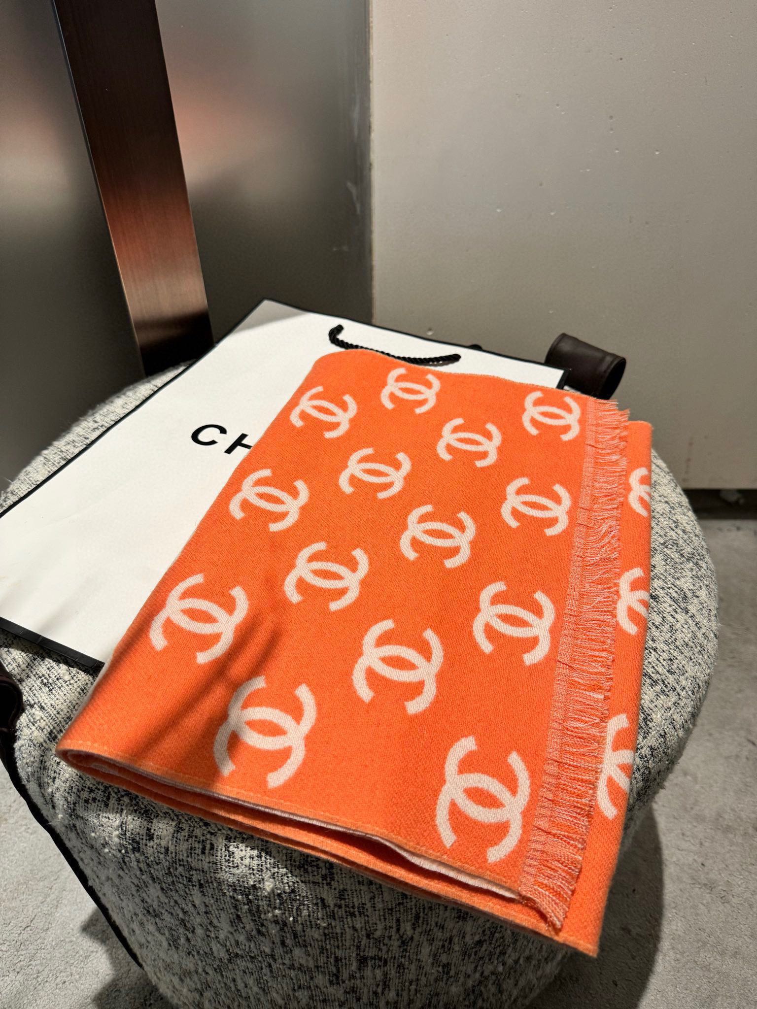 CC Scarf 180 CM In Orange Mix Beige Print Logo Wool And Cashmere 359269