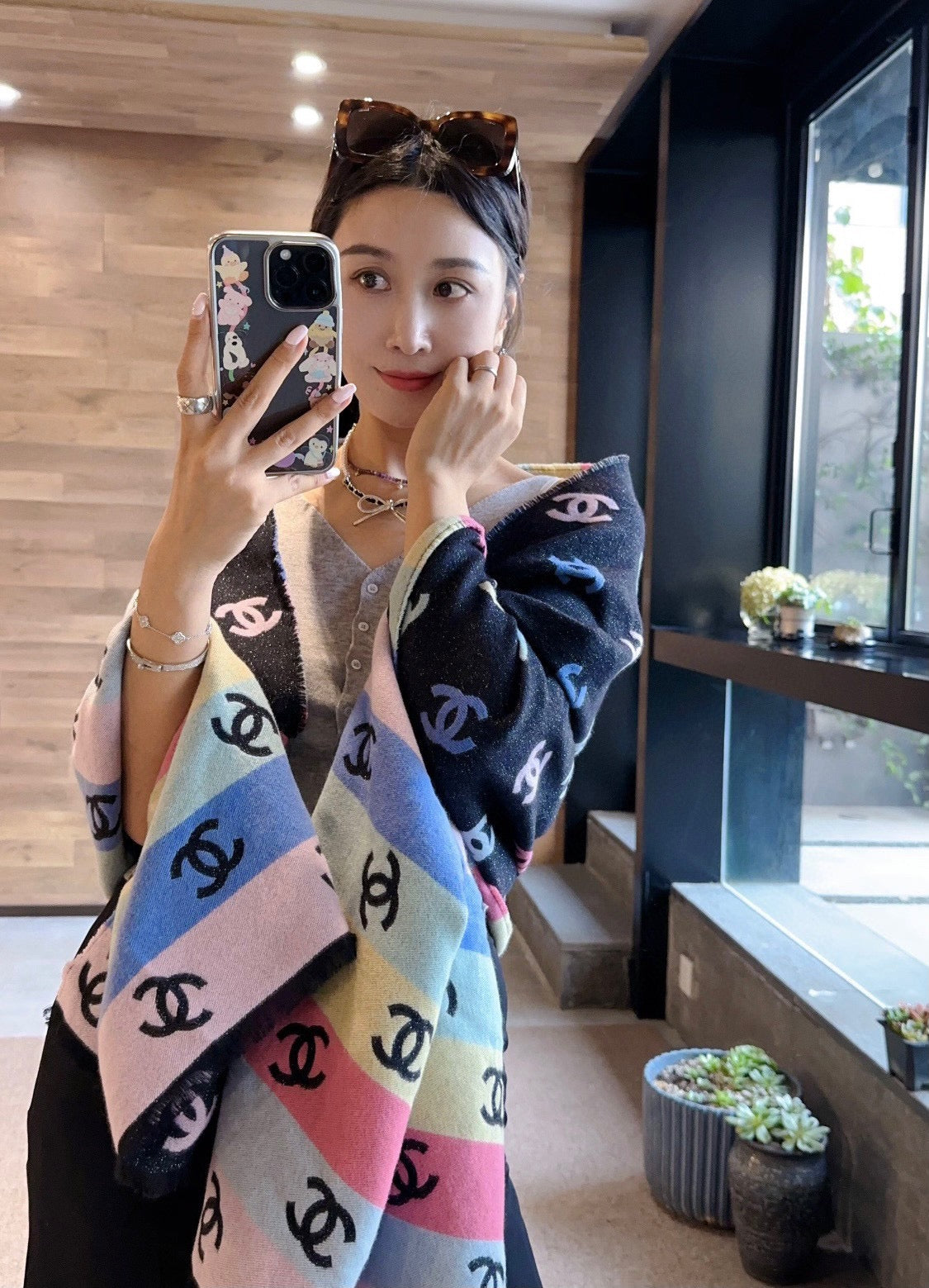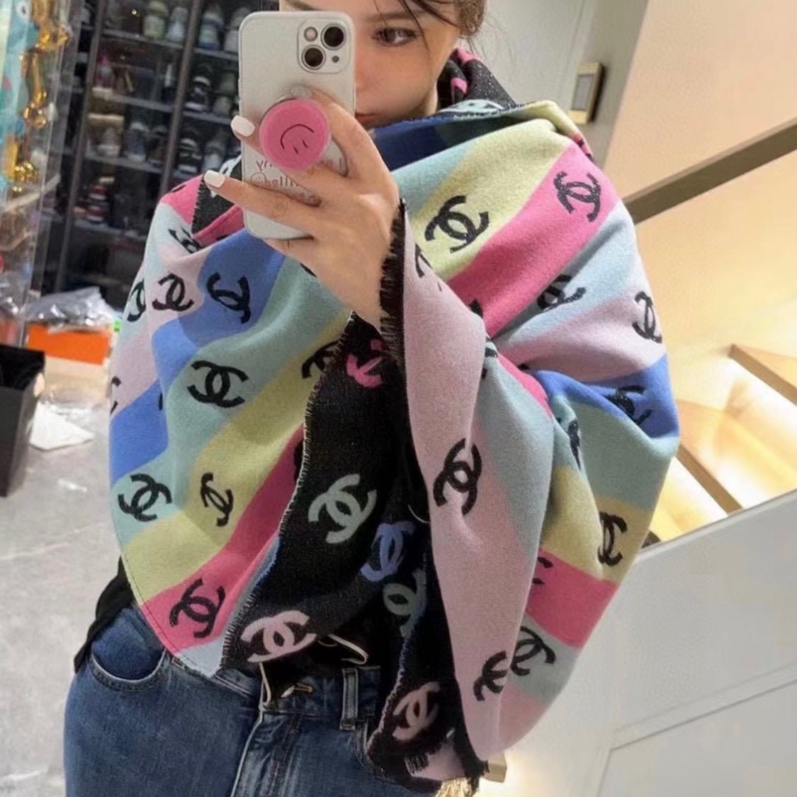 CC Scarf 187 CM In Black Rainbow Cashmere Mix Cotton And Mulberry Silk 421487