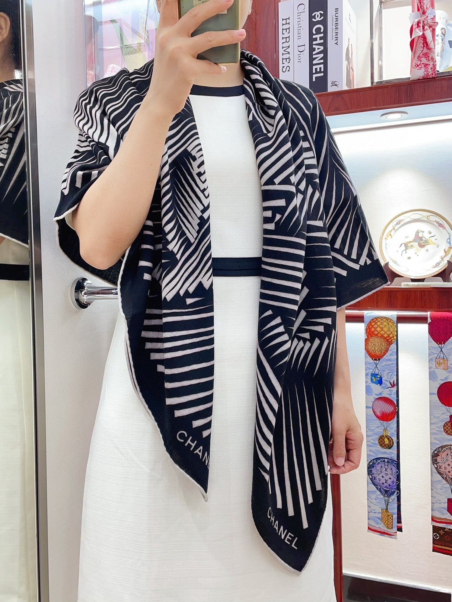 CC Square Scarf 140 CM In Black White Cashmere Mix Silk 382617