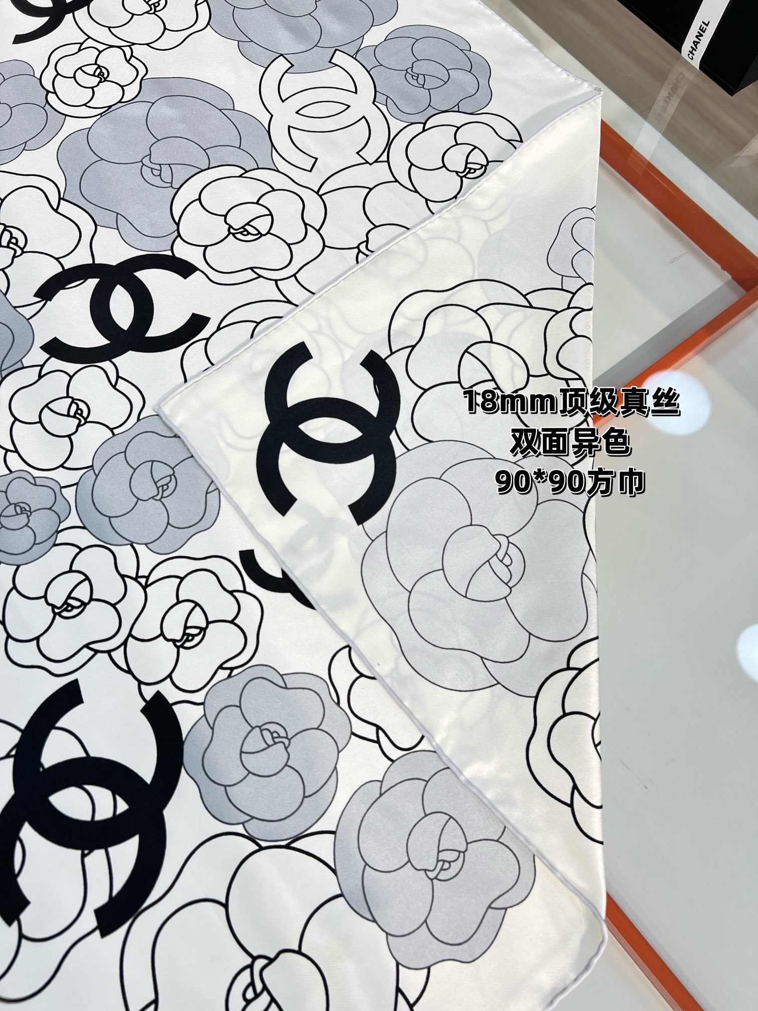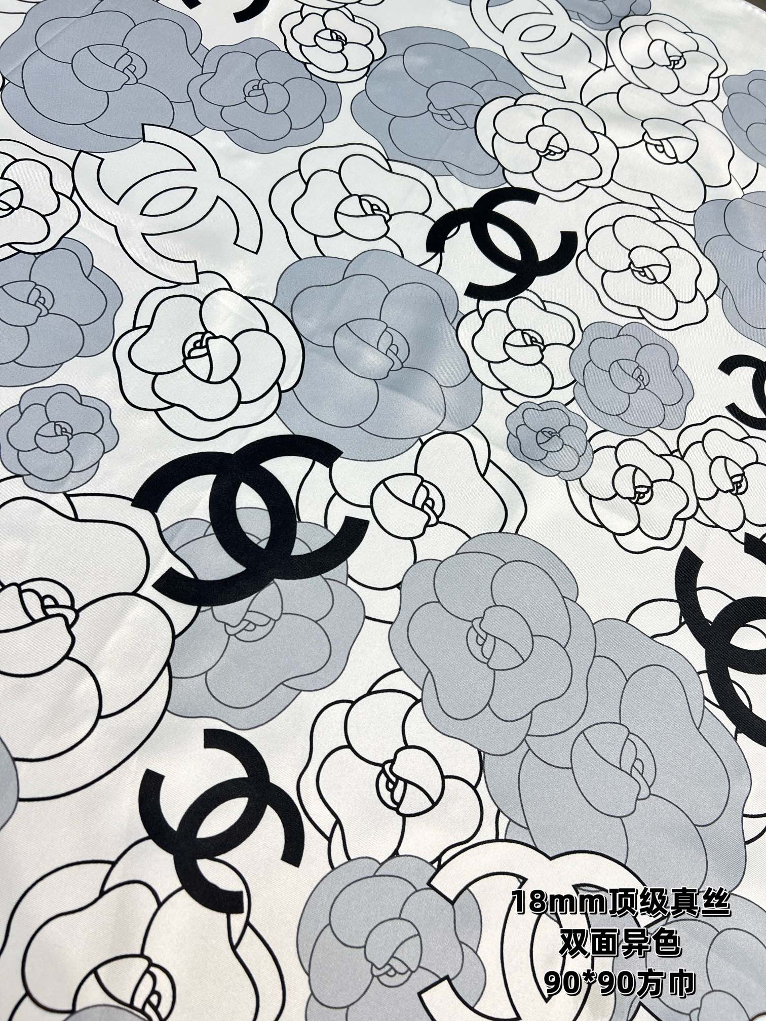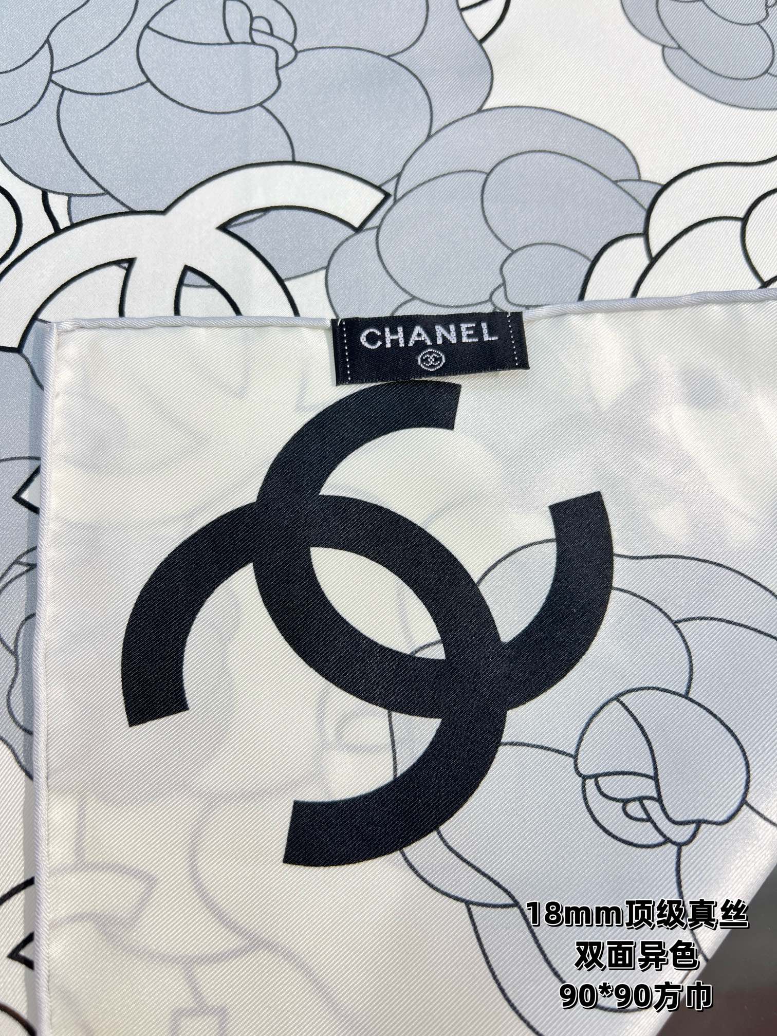 CC Square Scarf 90 CM In Grey Black And White Camellia Logo Print Silk Twill 288739