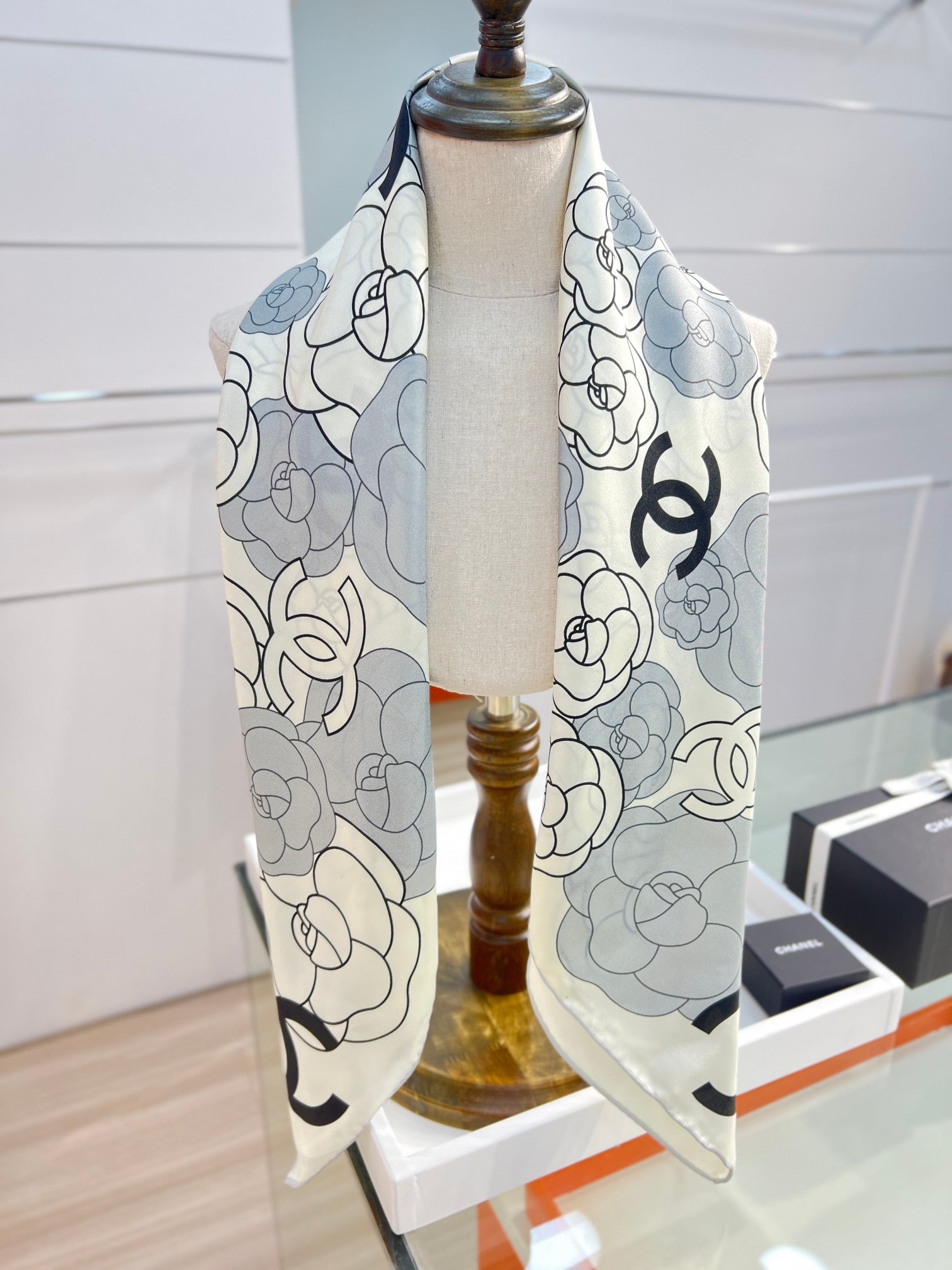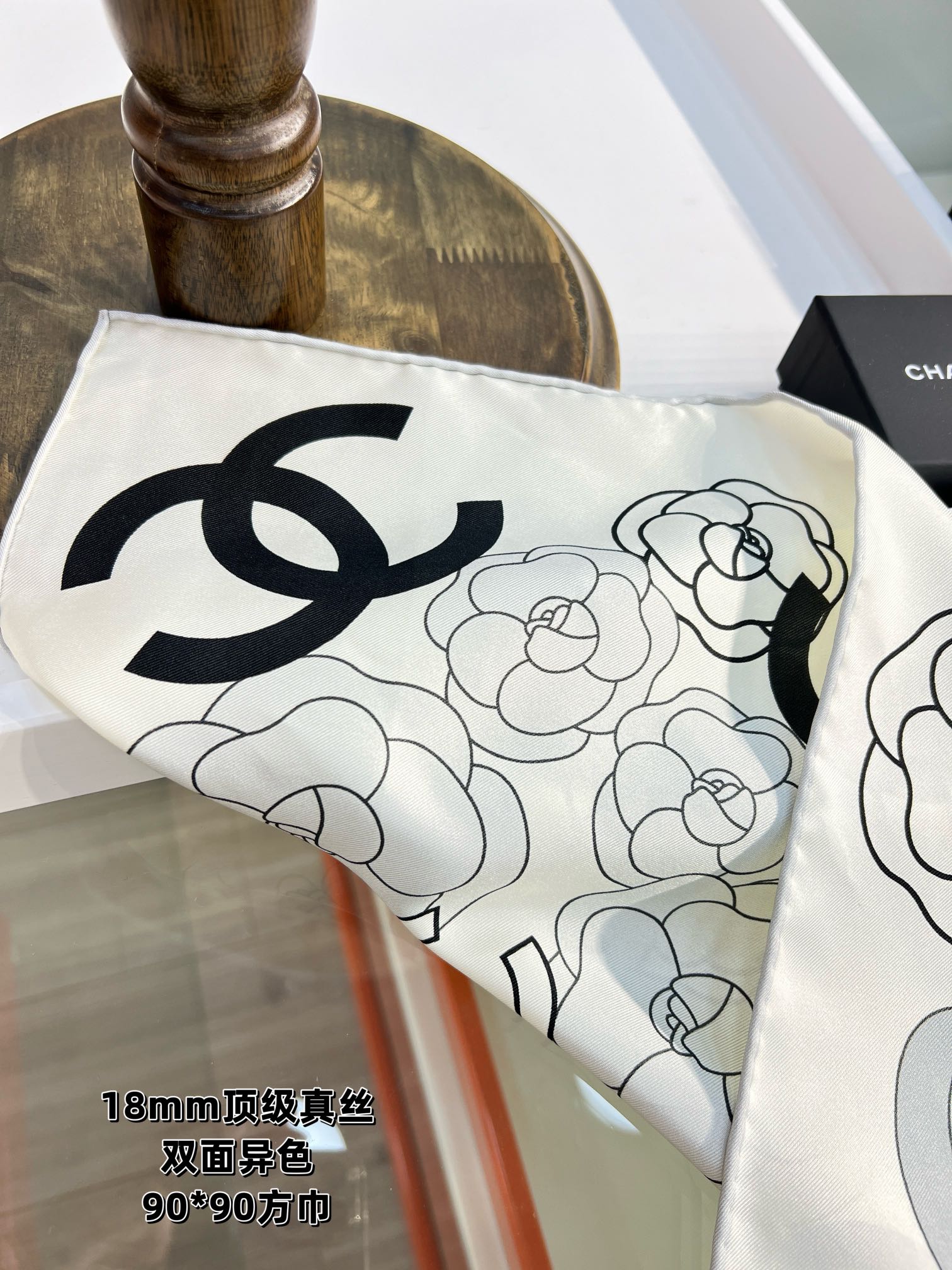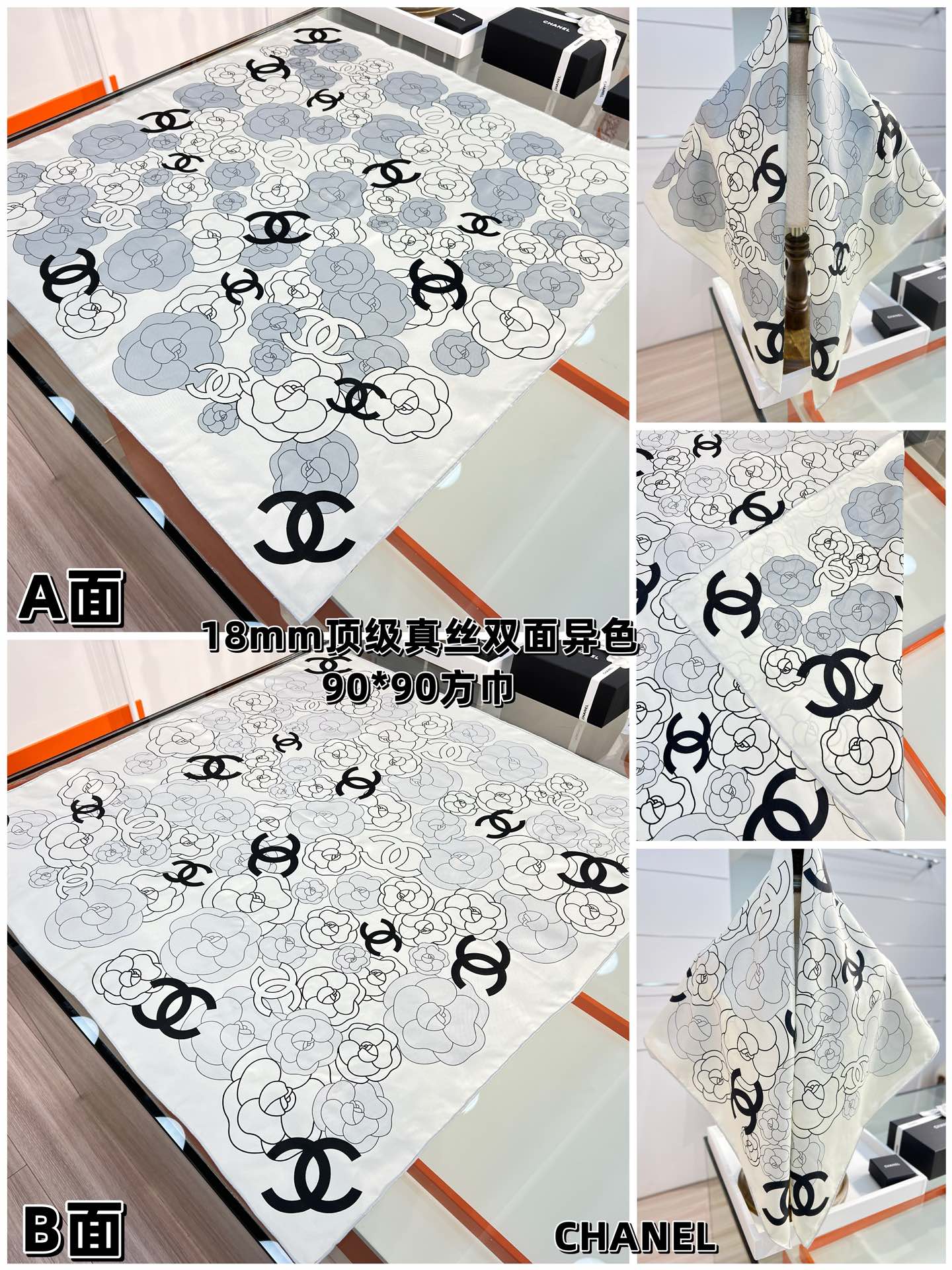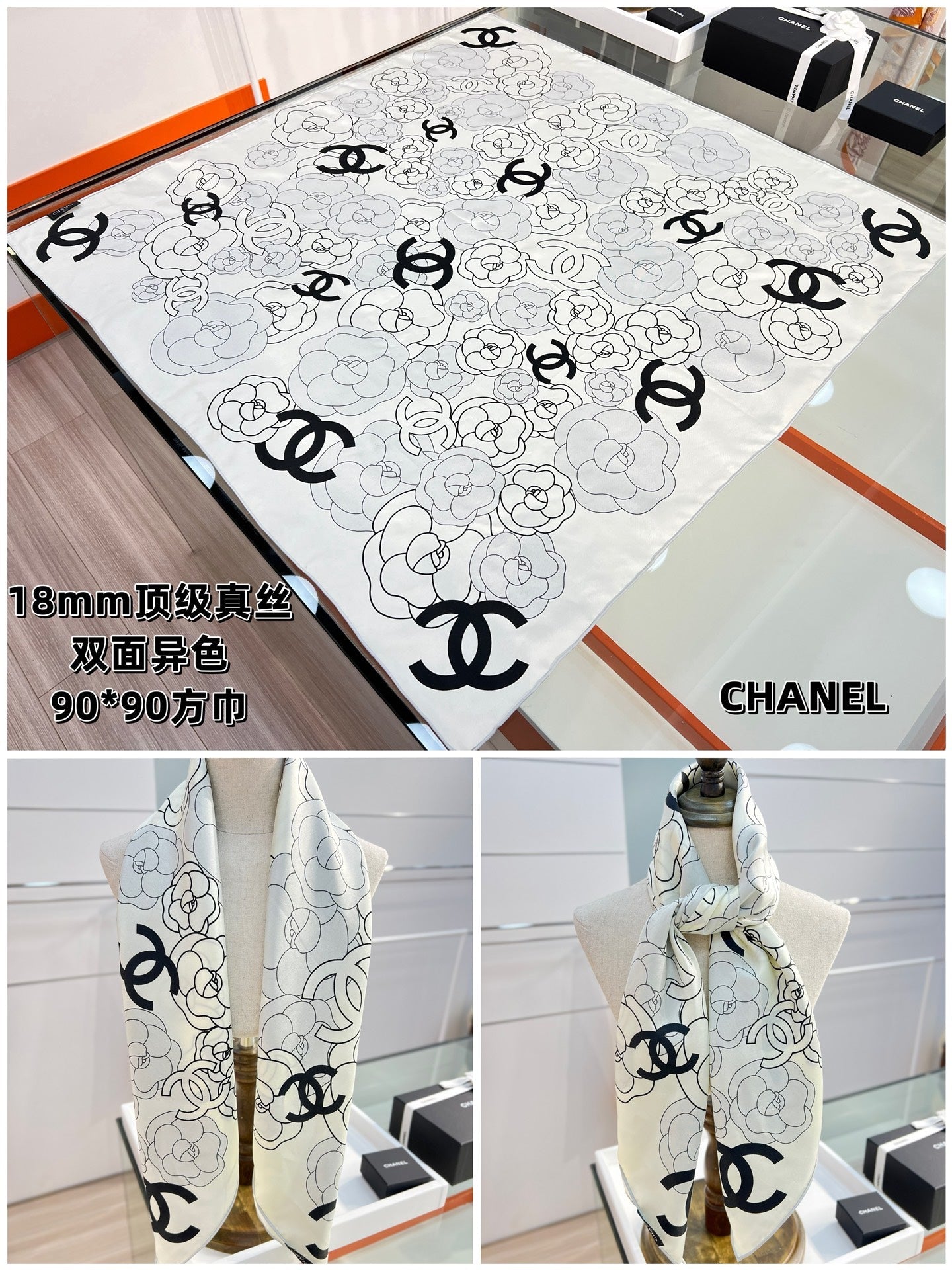 CC Square Scarf 90 CM In Grey Black And White Camellia Logo Print Silk Twill 288739