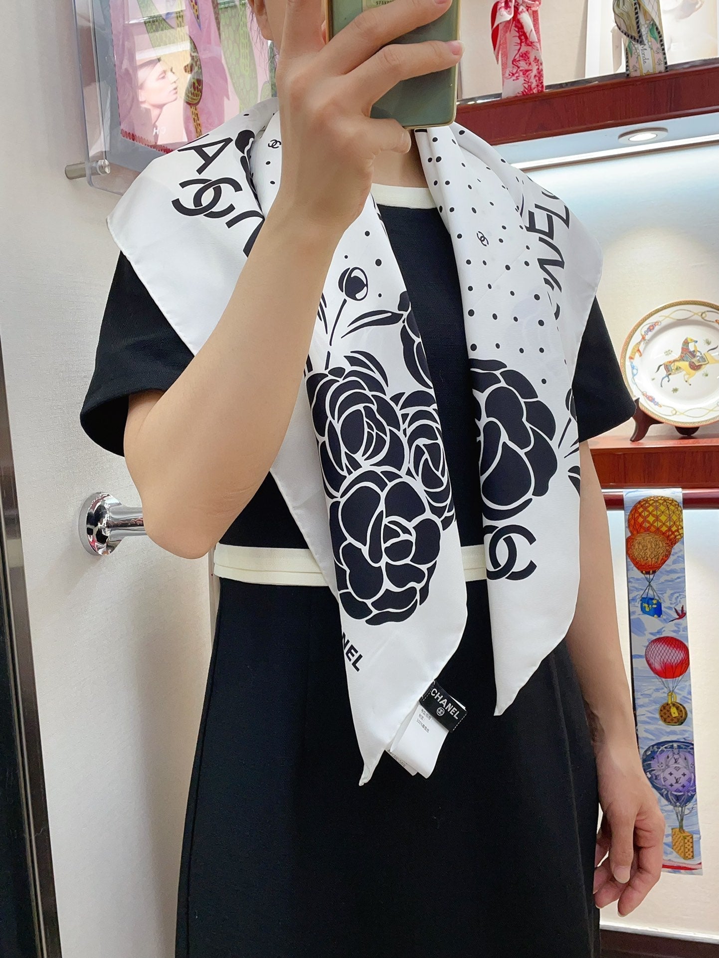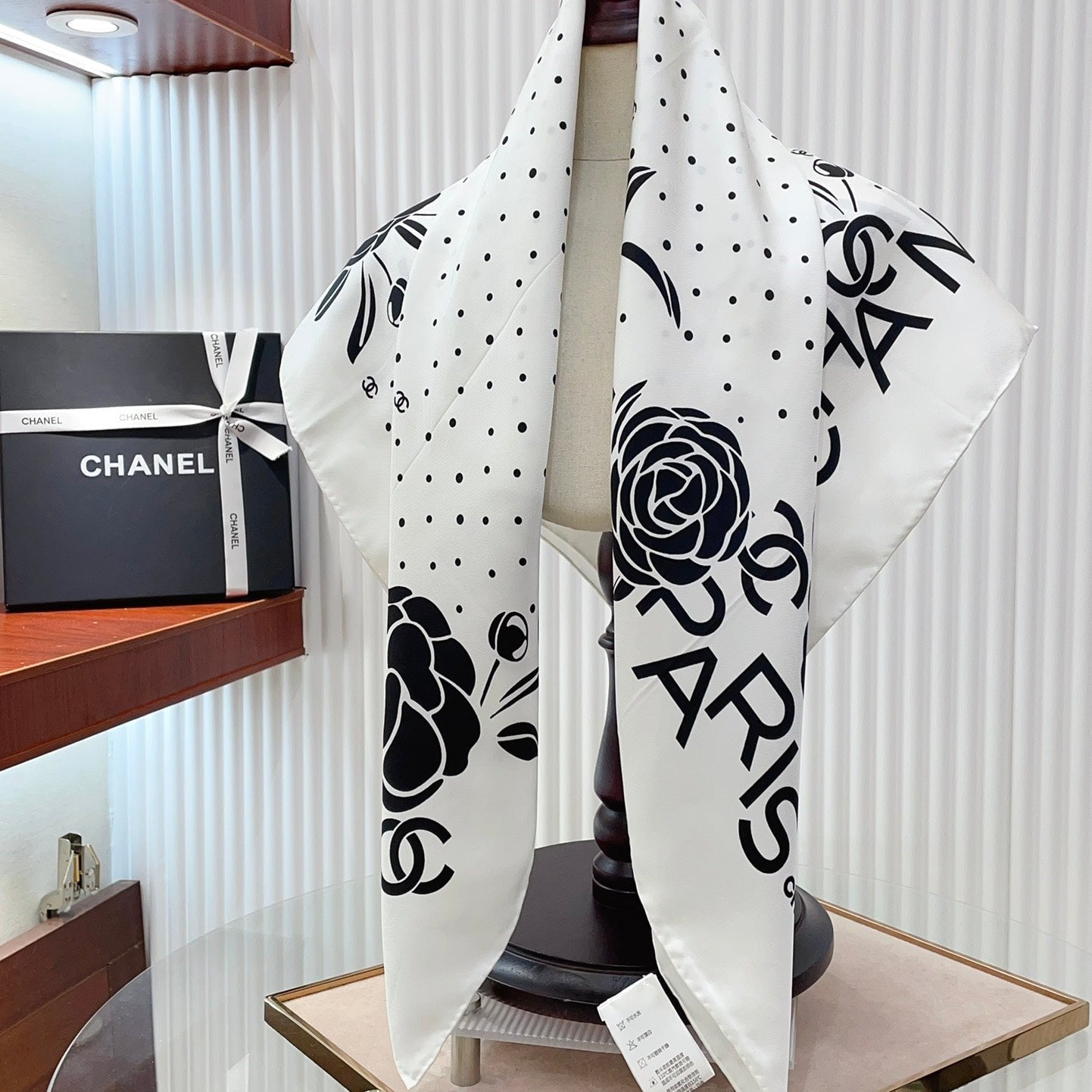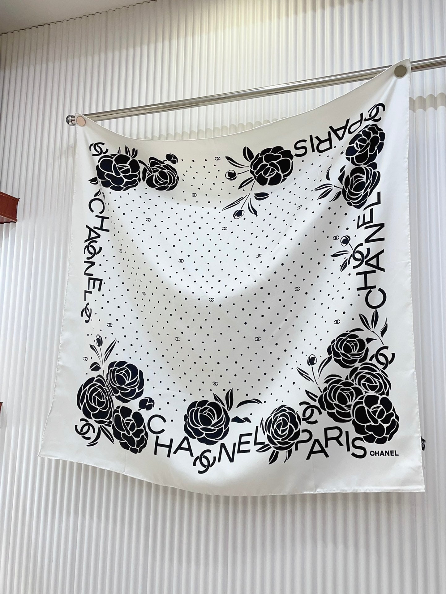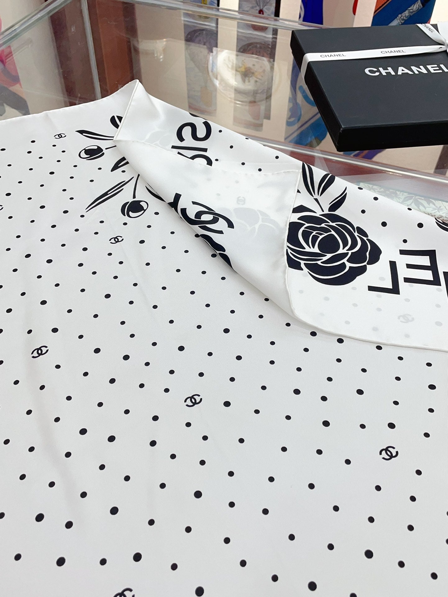 CC Square Scarf 90 CM In White Polka Dot Black Camellia Silk Twill 288722