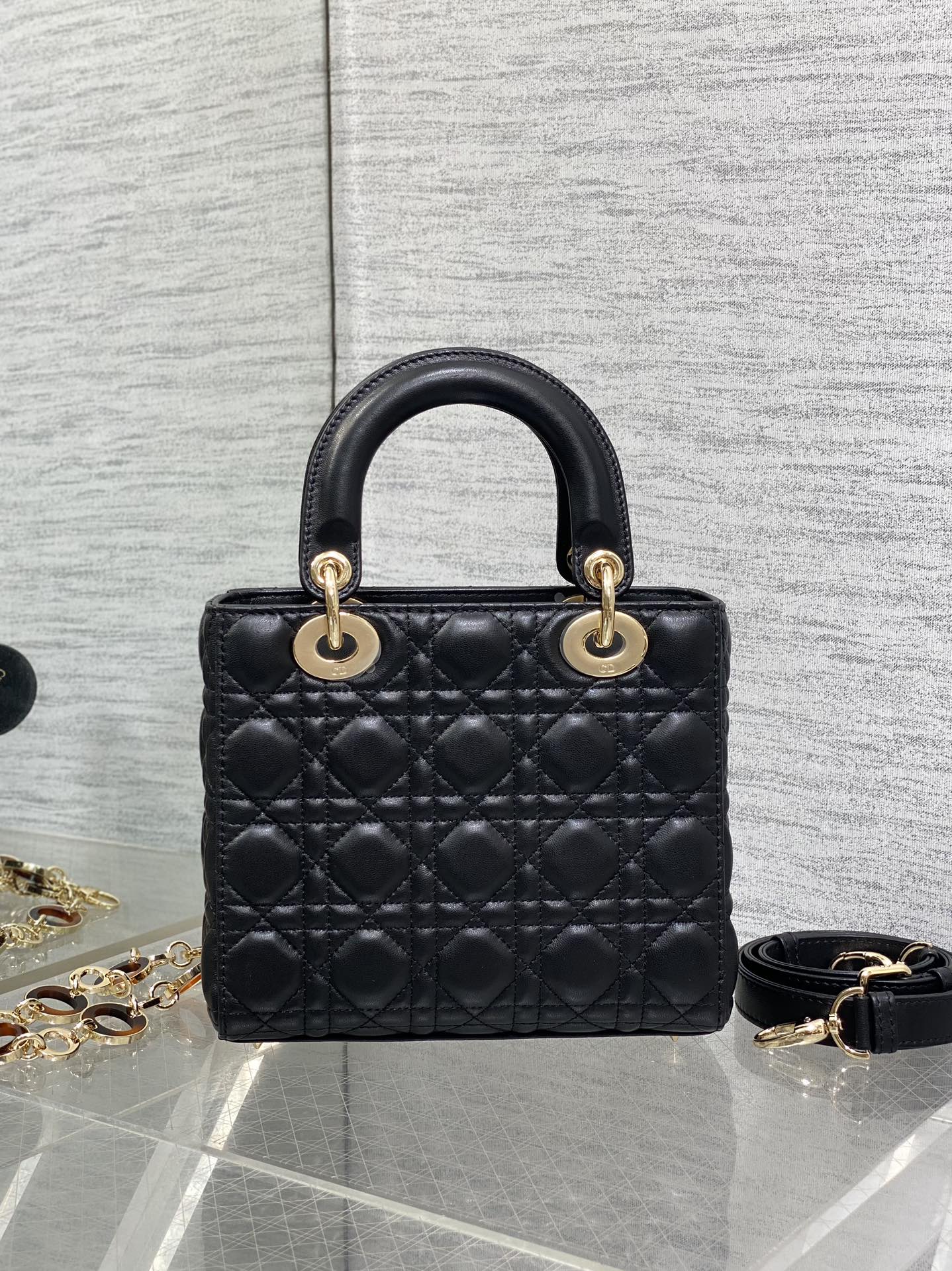 CD Lady Bag 20cm Black Lambskin Brown Charm