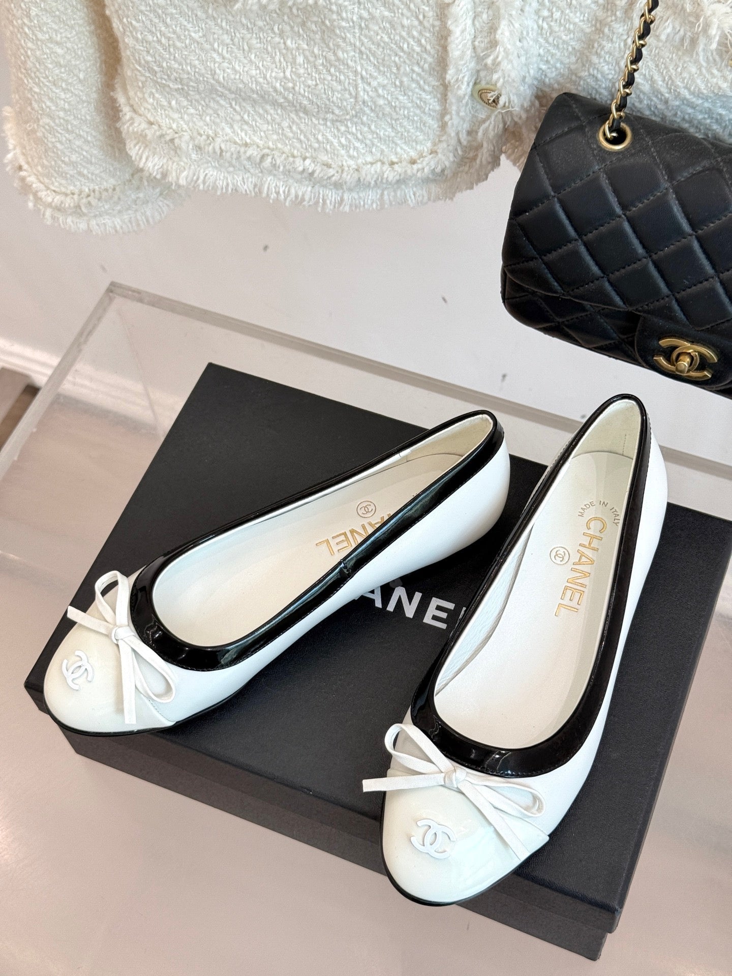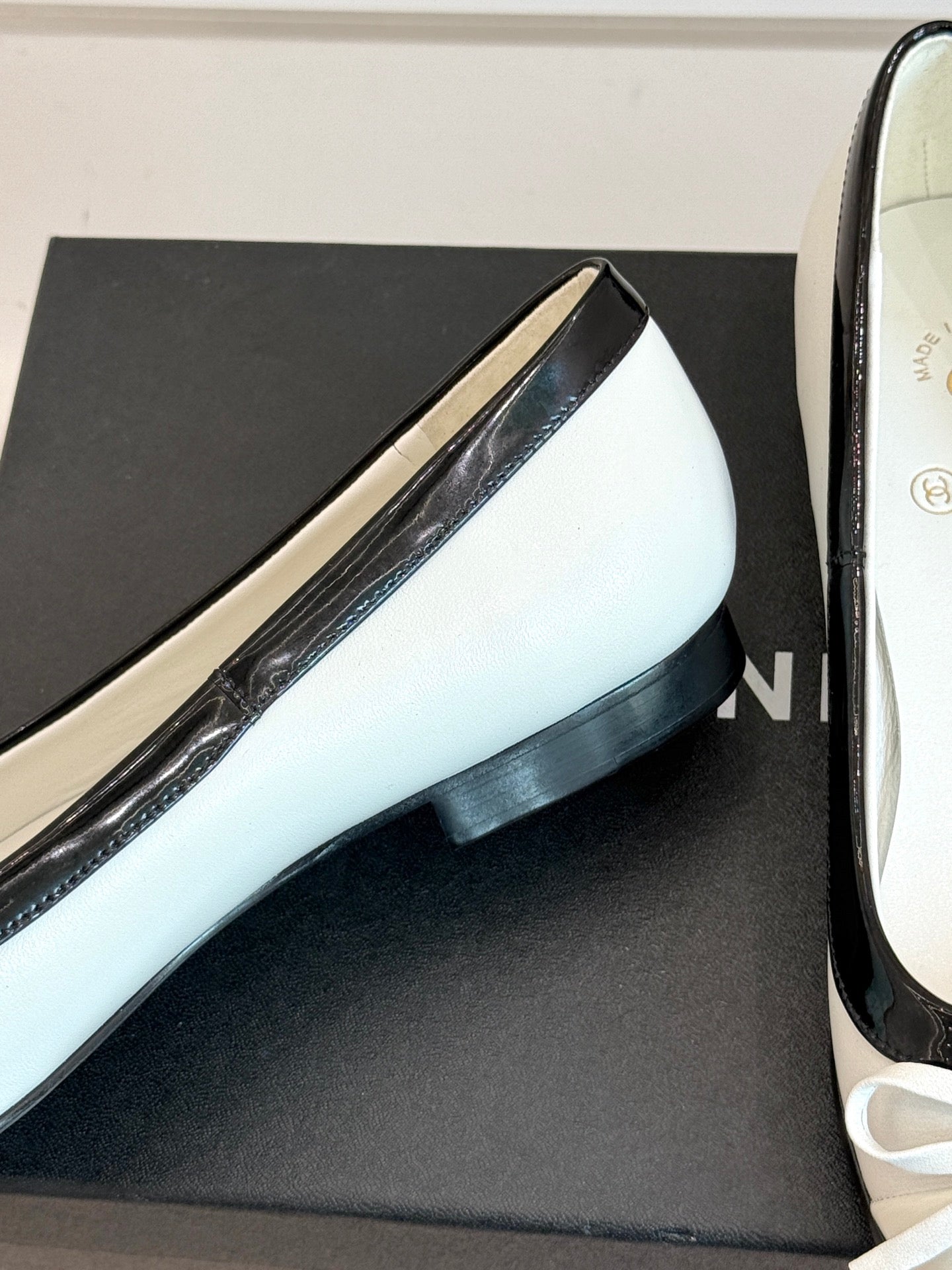 Chanel 25 Bowknot Ballet Flat White Black Sheepskin 473065