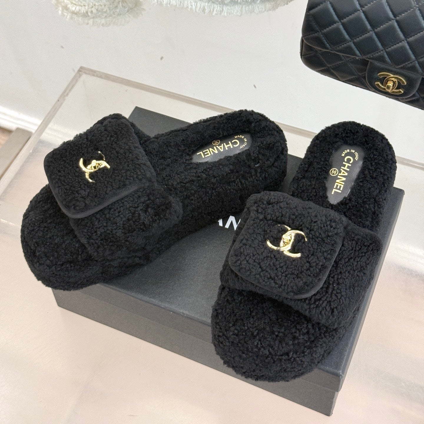 Chanel 25 Buckle Flip-up Thick-soled Slippers Black Wool 465386