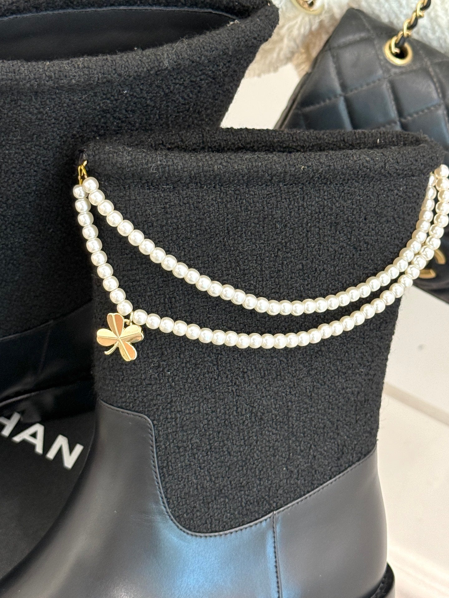 Chanel 25 Four-Leaf Clover Pearls Double C Boots Black Woven Sheepskin 465405