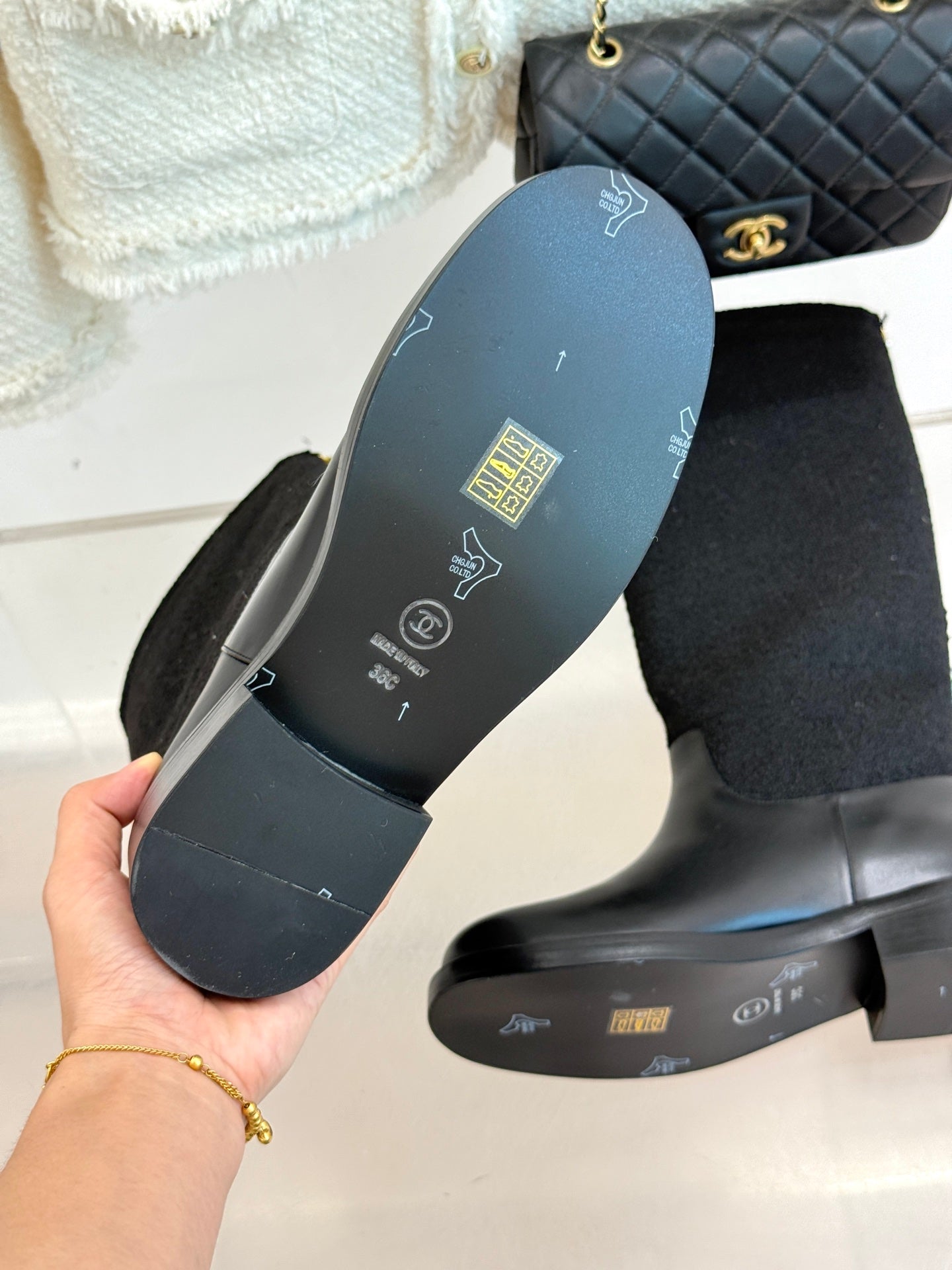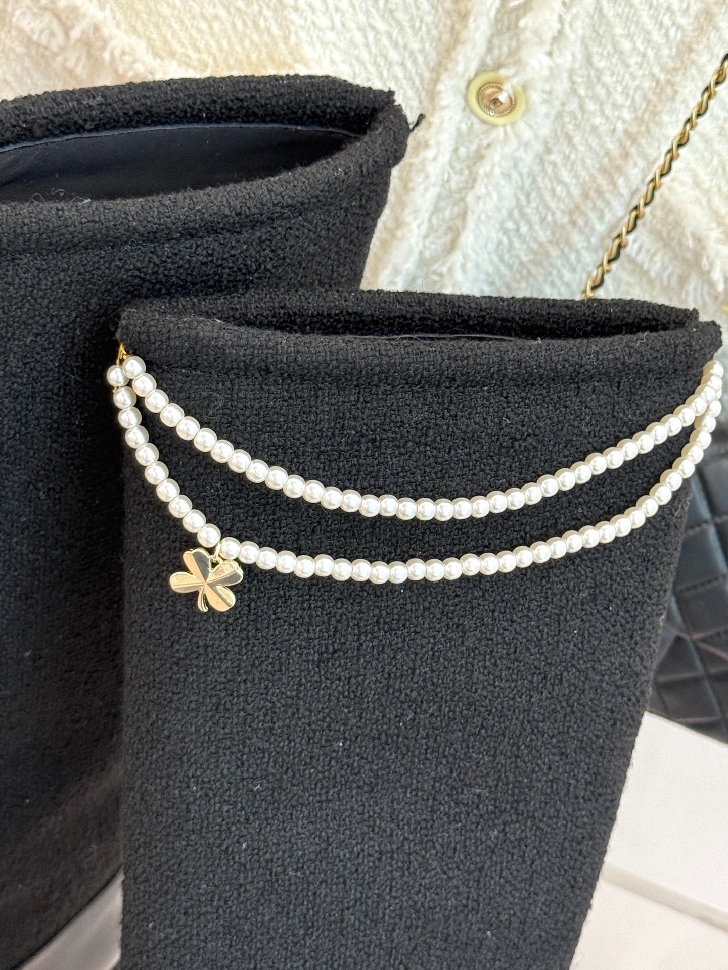 Chanel 25 Four-Leaf Clover Pearls Double C Long Boots Black Woven Sheepskin 465407