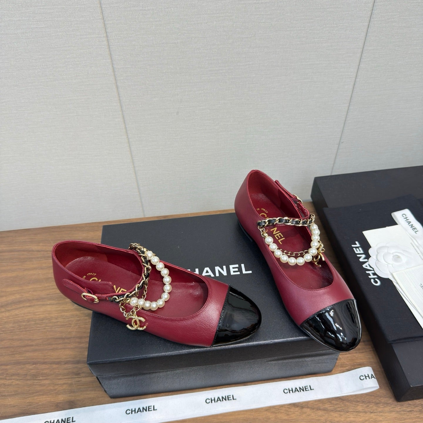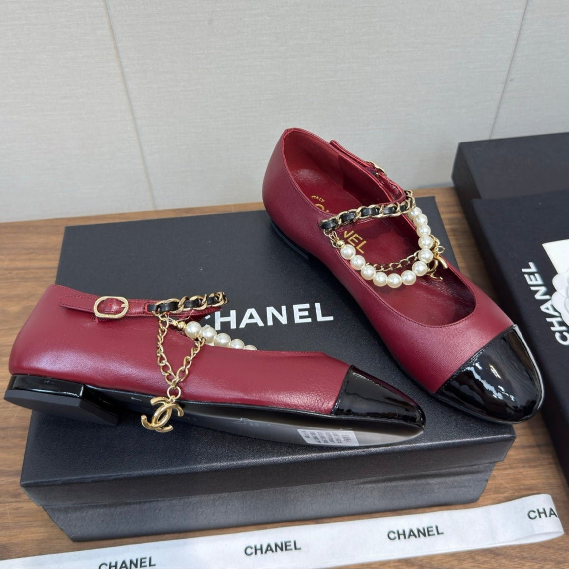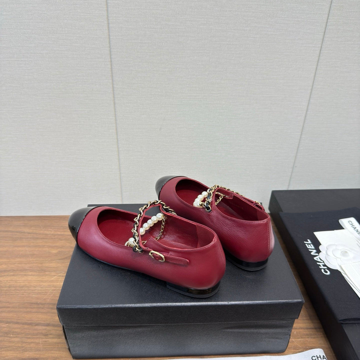 Chanel 25 Mary Jane Ankle Chain Ballet Flat Burgundy black Cowhide 465596