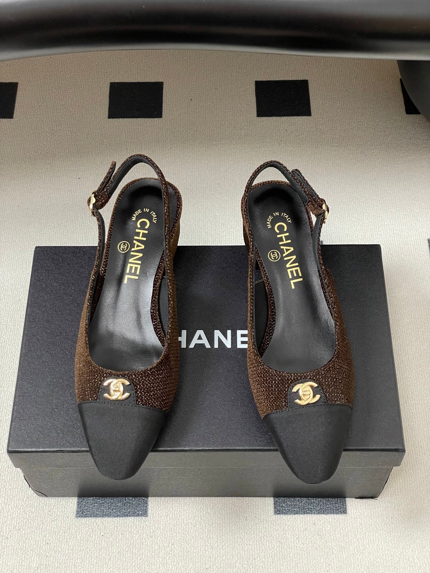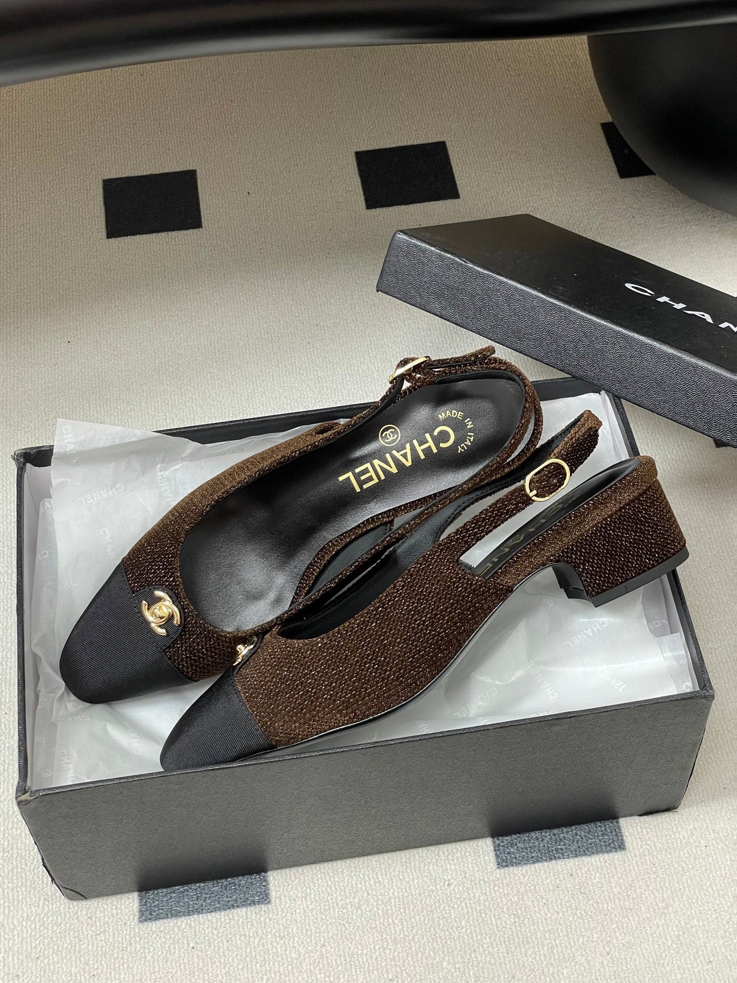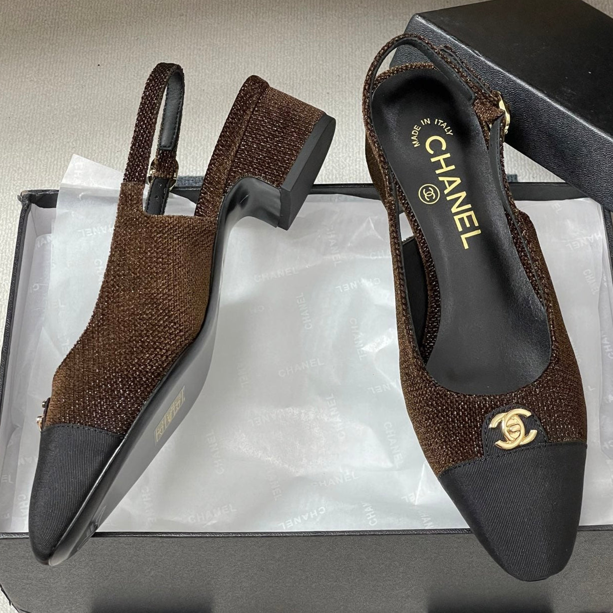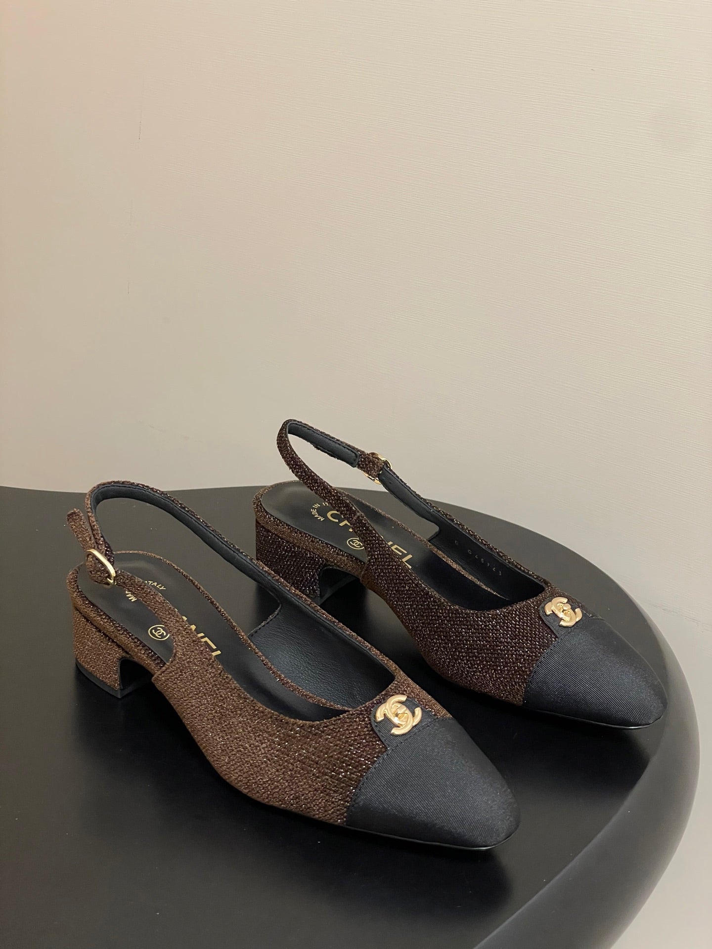 Chanel 25 Slingback Black Brown Lambskin Fabric 473210