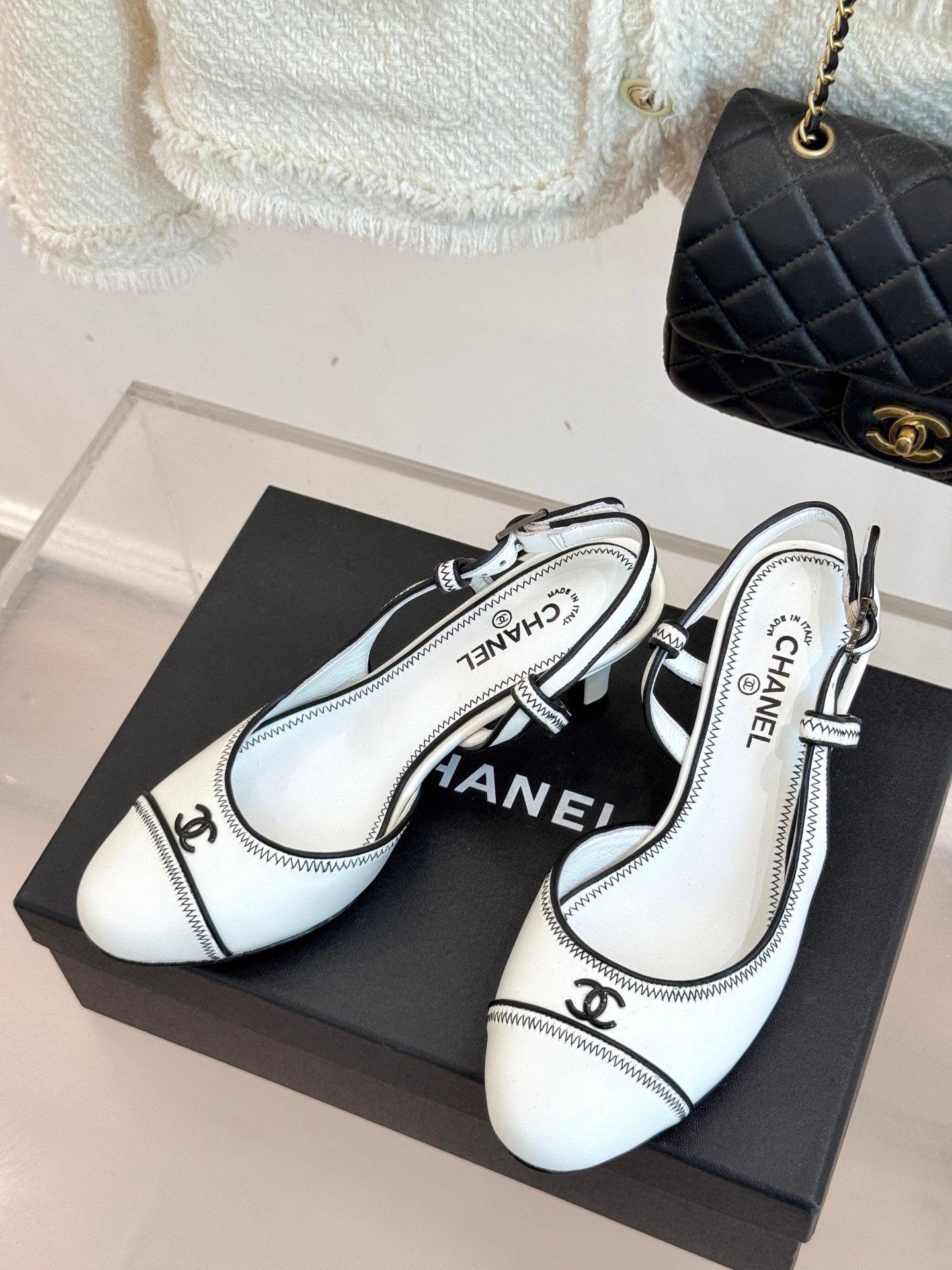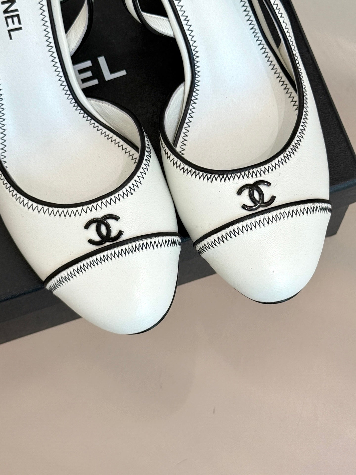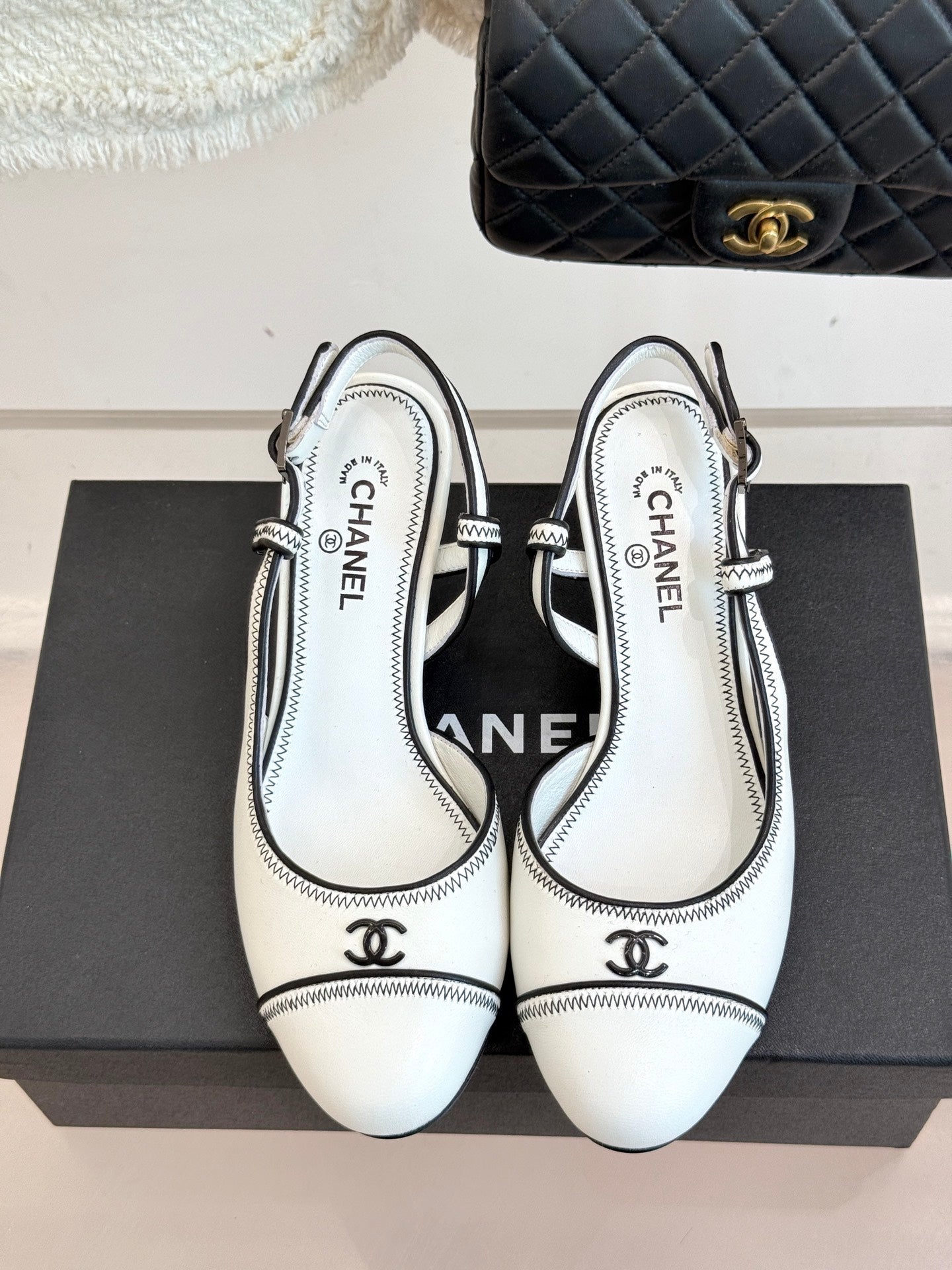 Chanel 25 Slingback White Black Sheepskin 473059
