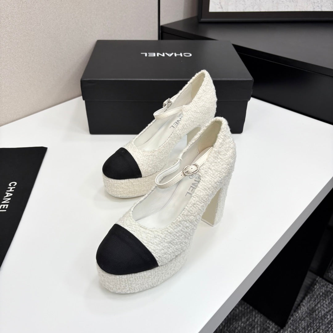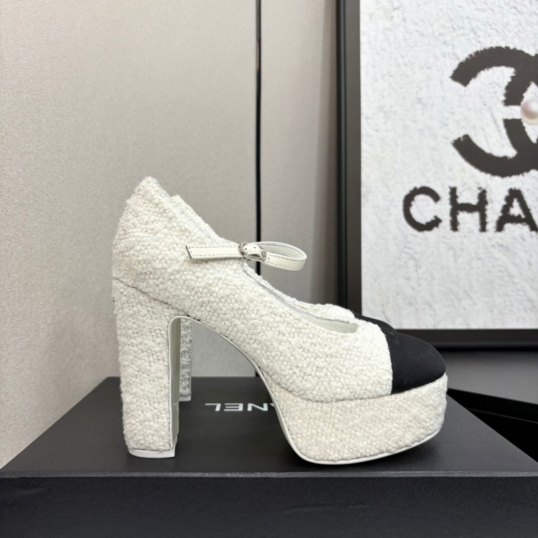 Chanel 25 Platform Thick Heel Shoe White Black Sheepskin