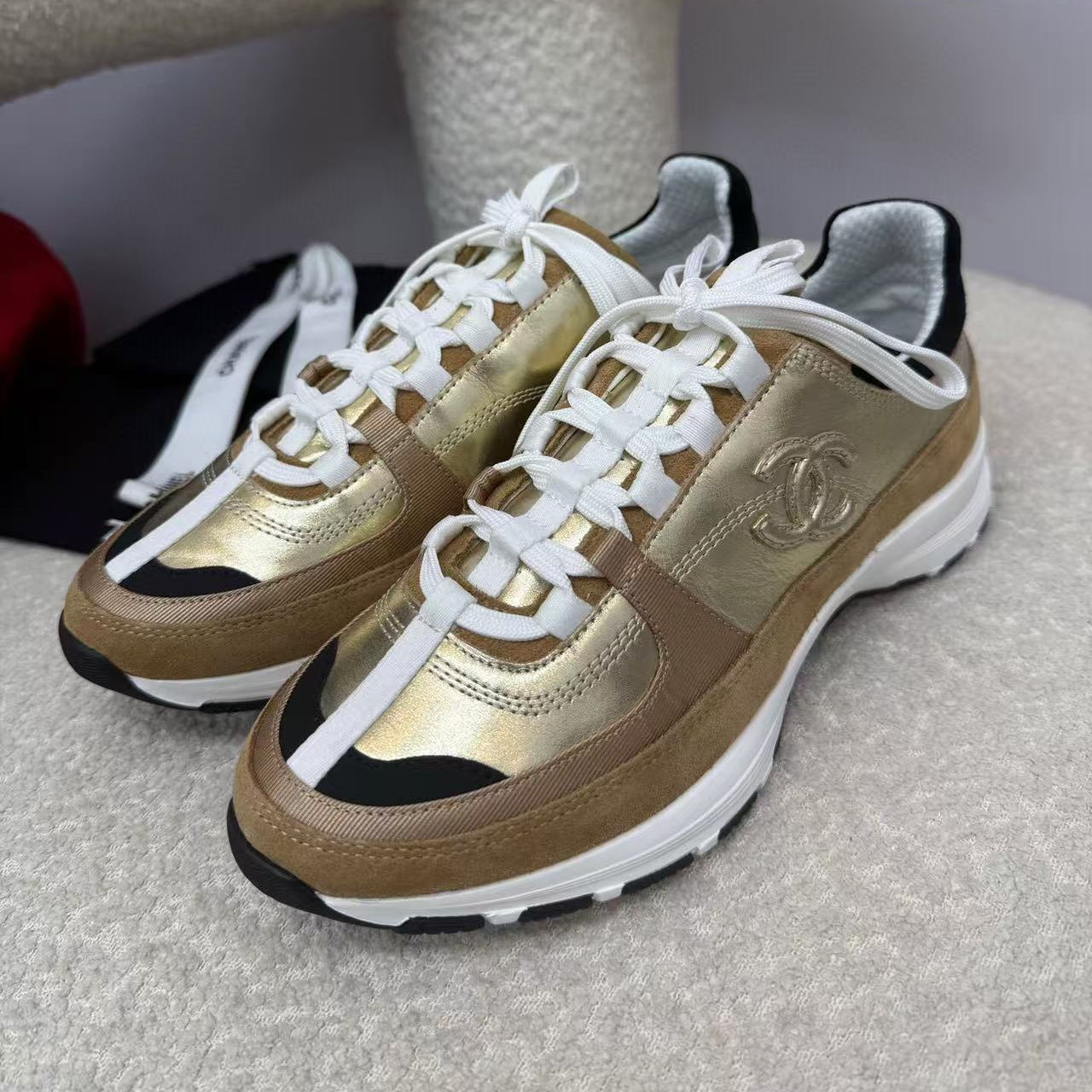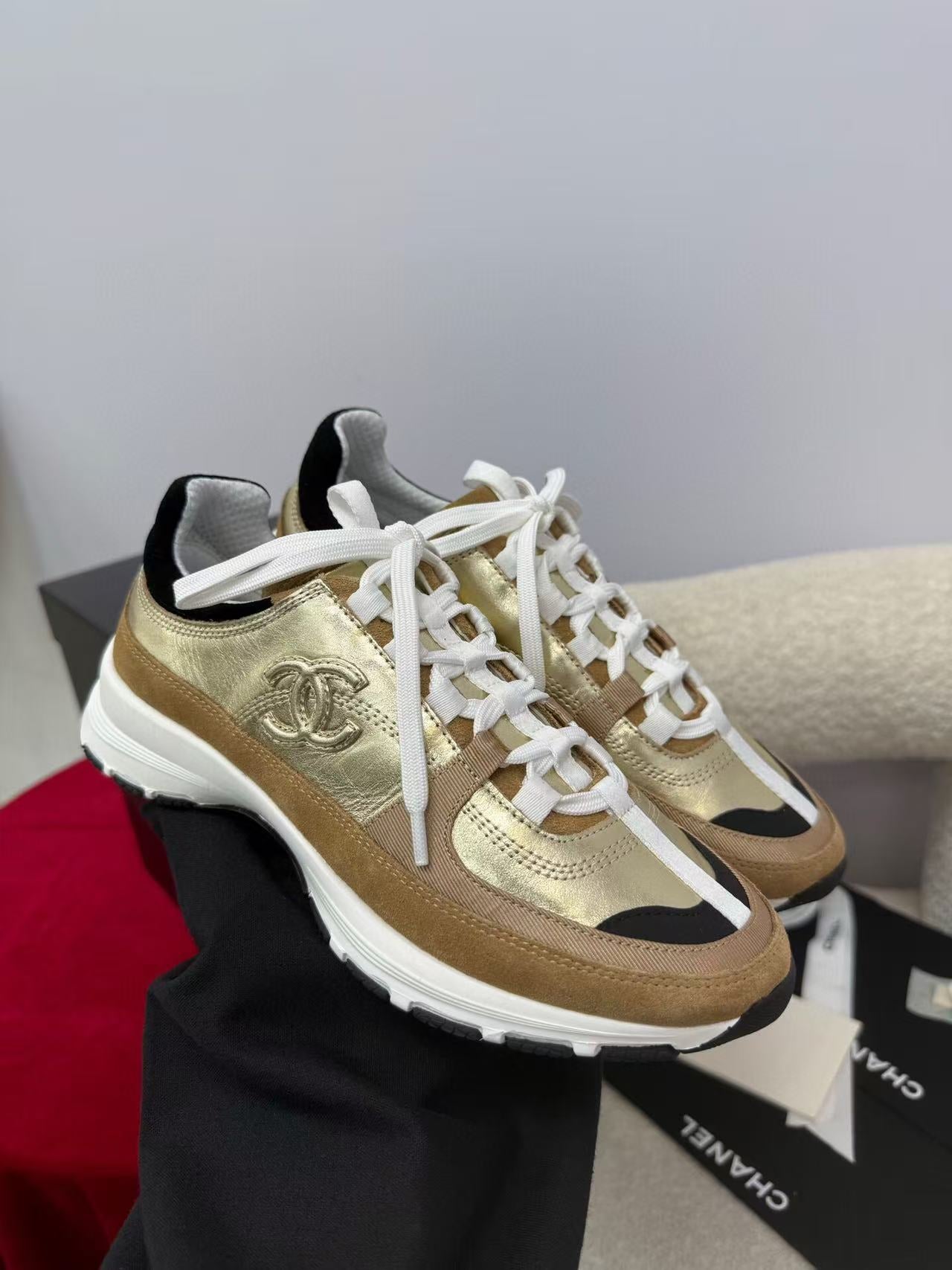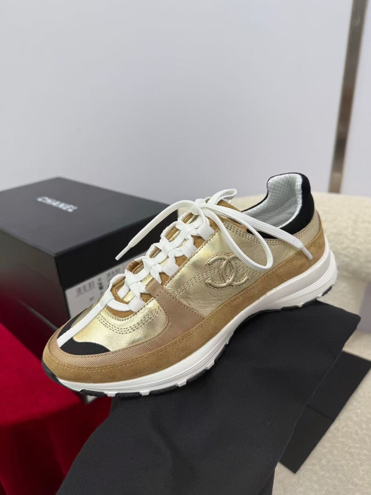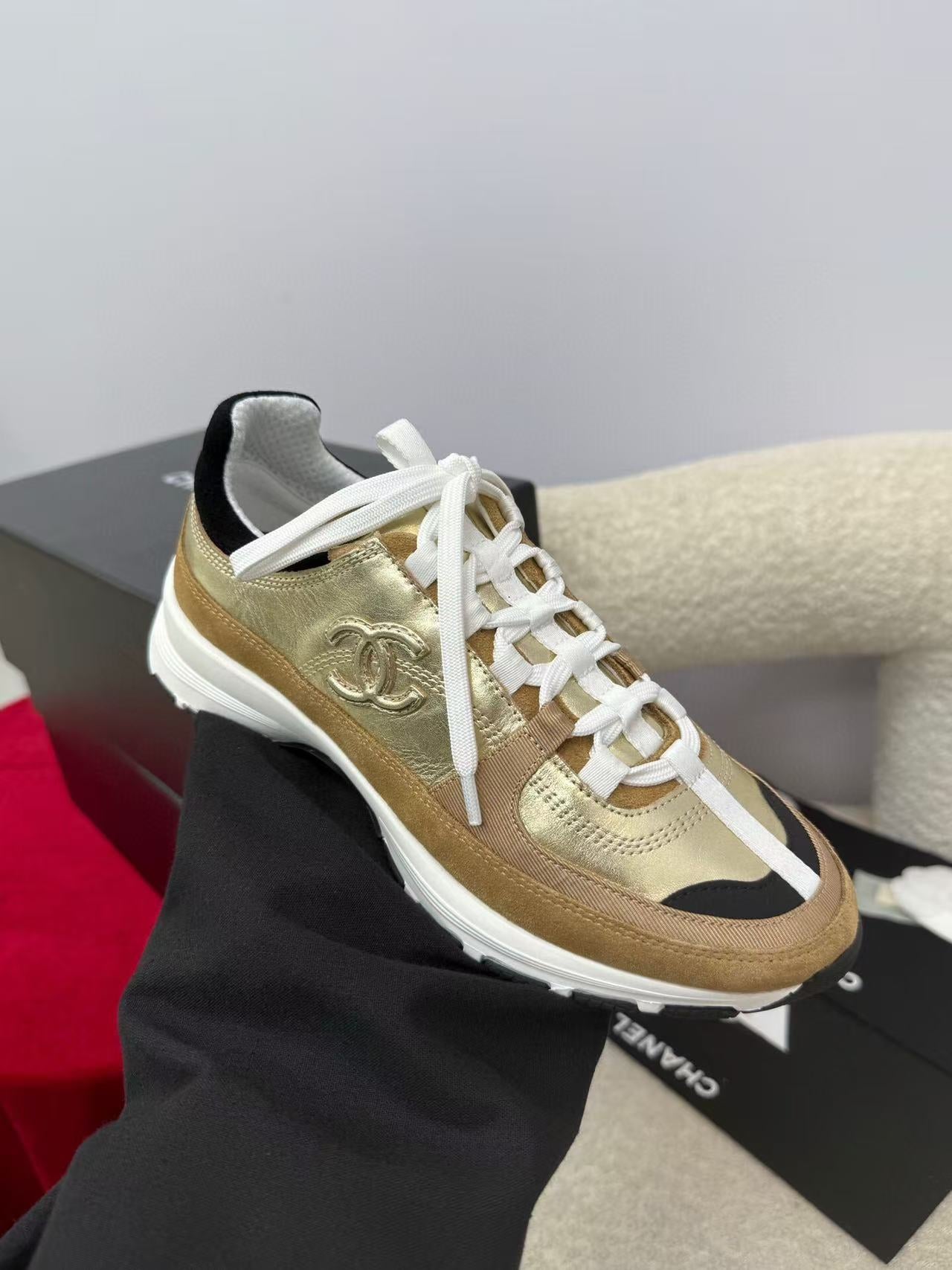 Chanel Sneaker Gold Brown Suede Leather